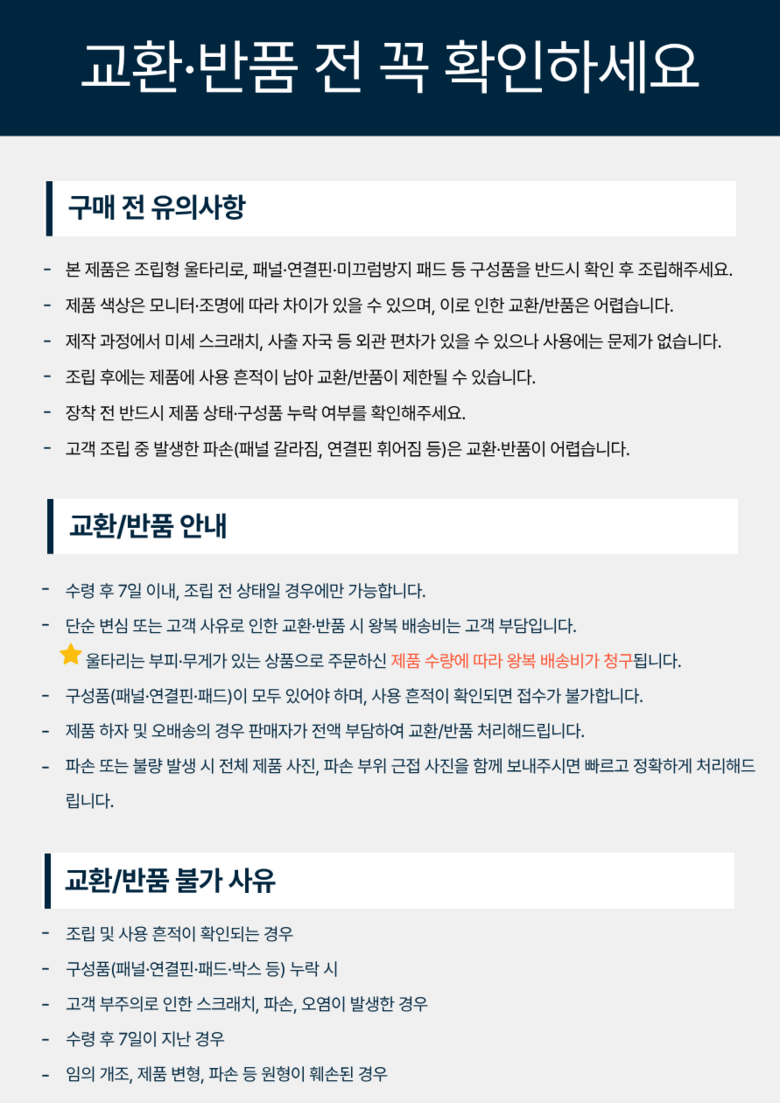 - ㆍ교환/반품에 관한 일반적인 사항은 판매자가 제시사항보다 관계법령이 우선합니다.