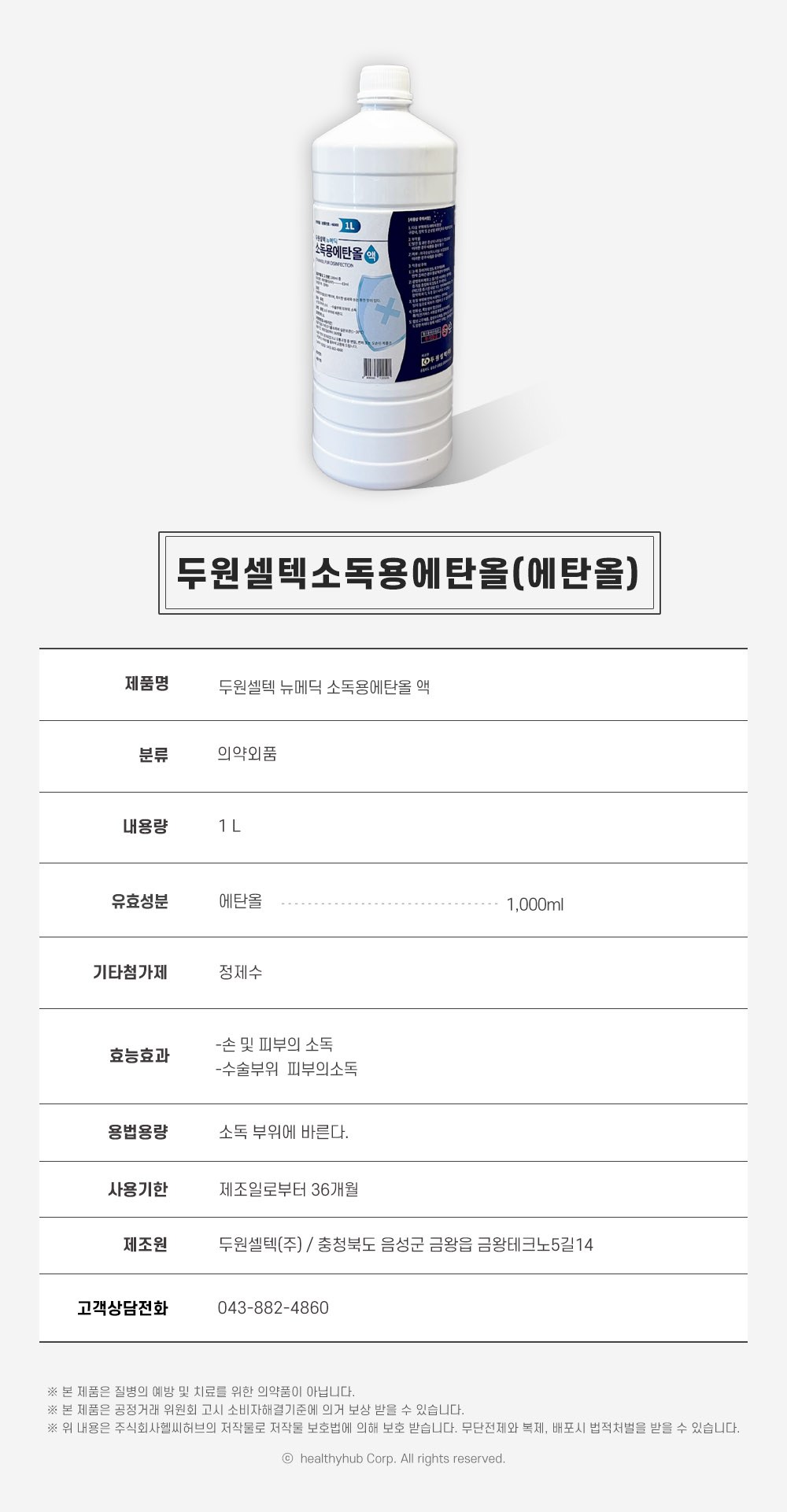 | 품명 및 모델명 | 두원셀텍소독용에탄올(에탄올) | 인증/허가 사항 | 의약외품 |