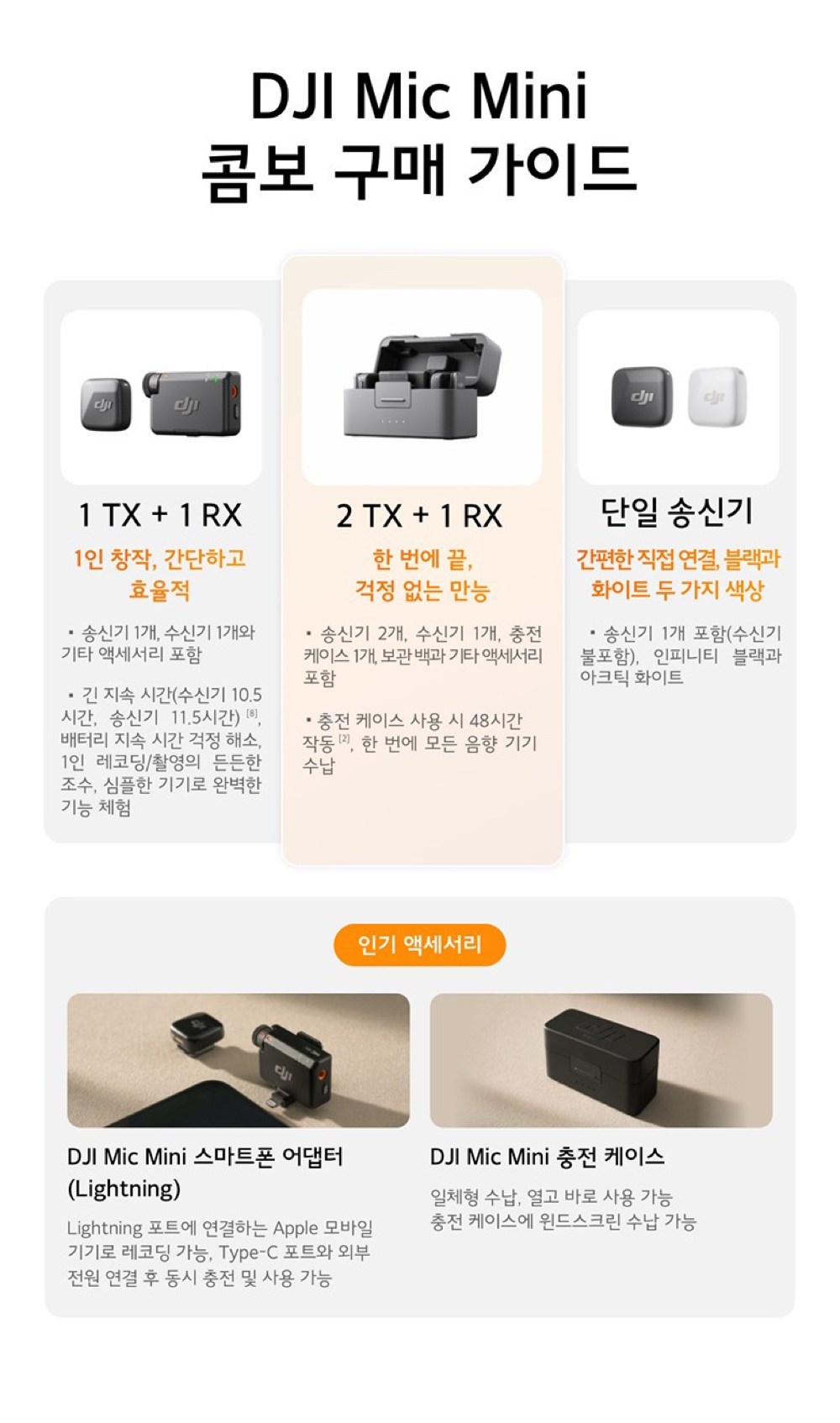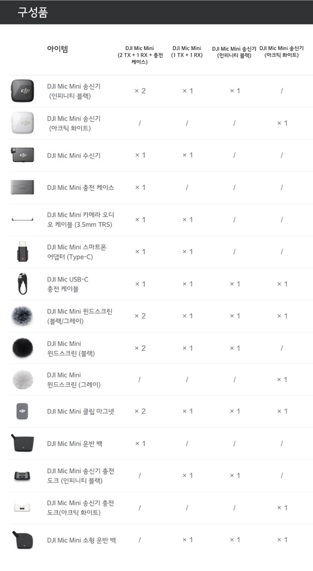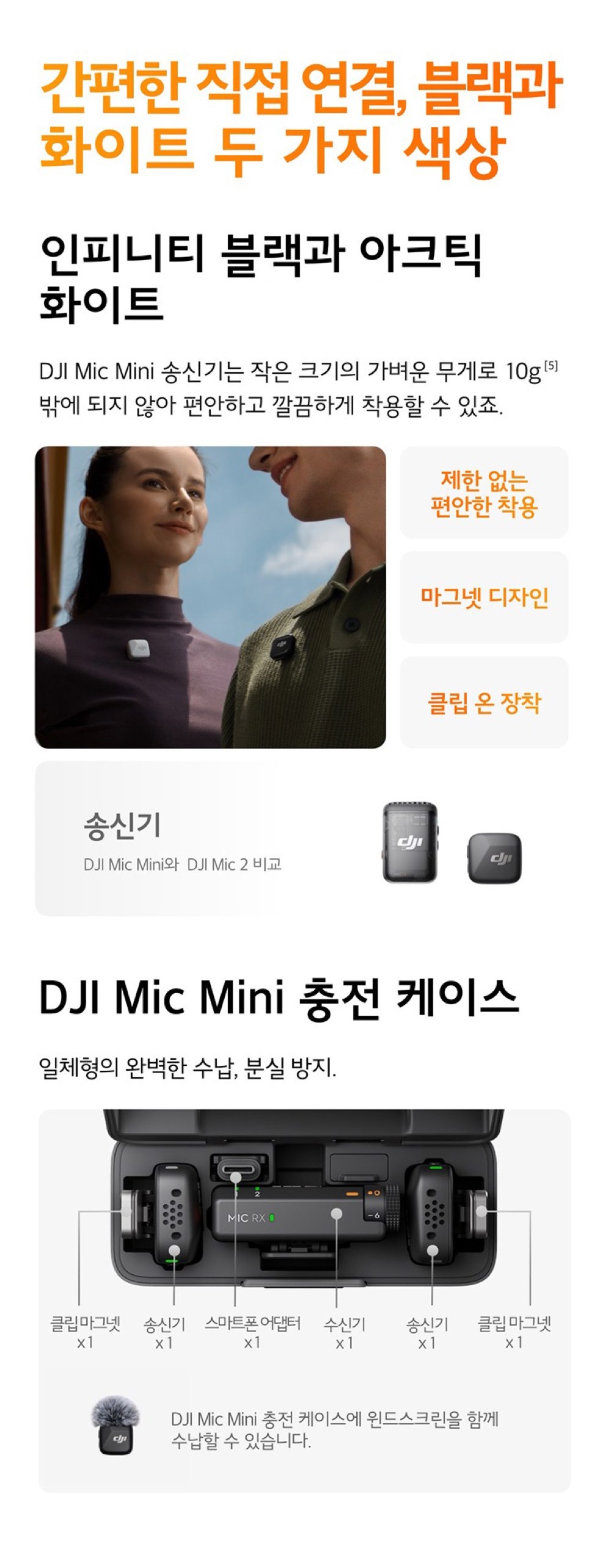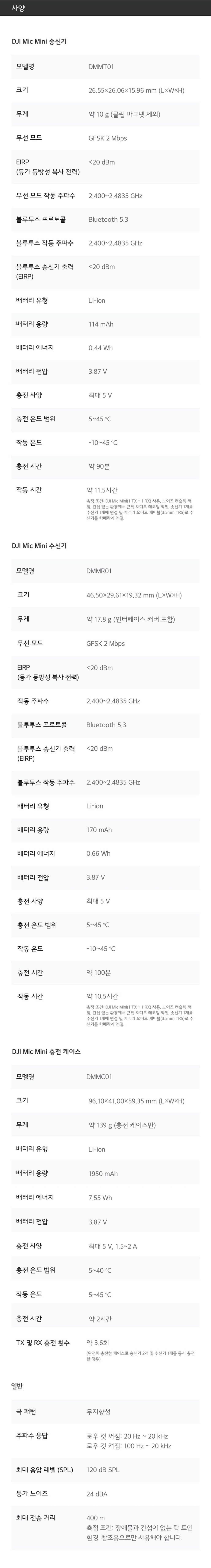 - 구성품: 송신기(2개) + 수신기 + 충전 케이스 + 카메라 오디오 케이블 + 스마트폰 어댑터 + 충전 케이블 + 윈드스크린(블랙/그레이)(2개) + 윈드스크린(블랙)(2개) + 클립 마그넷(2개) + 운반 백