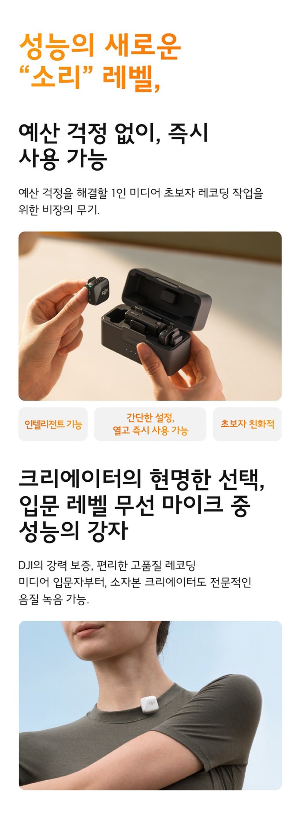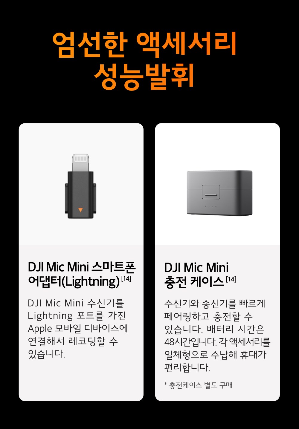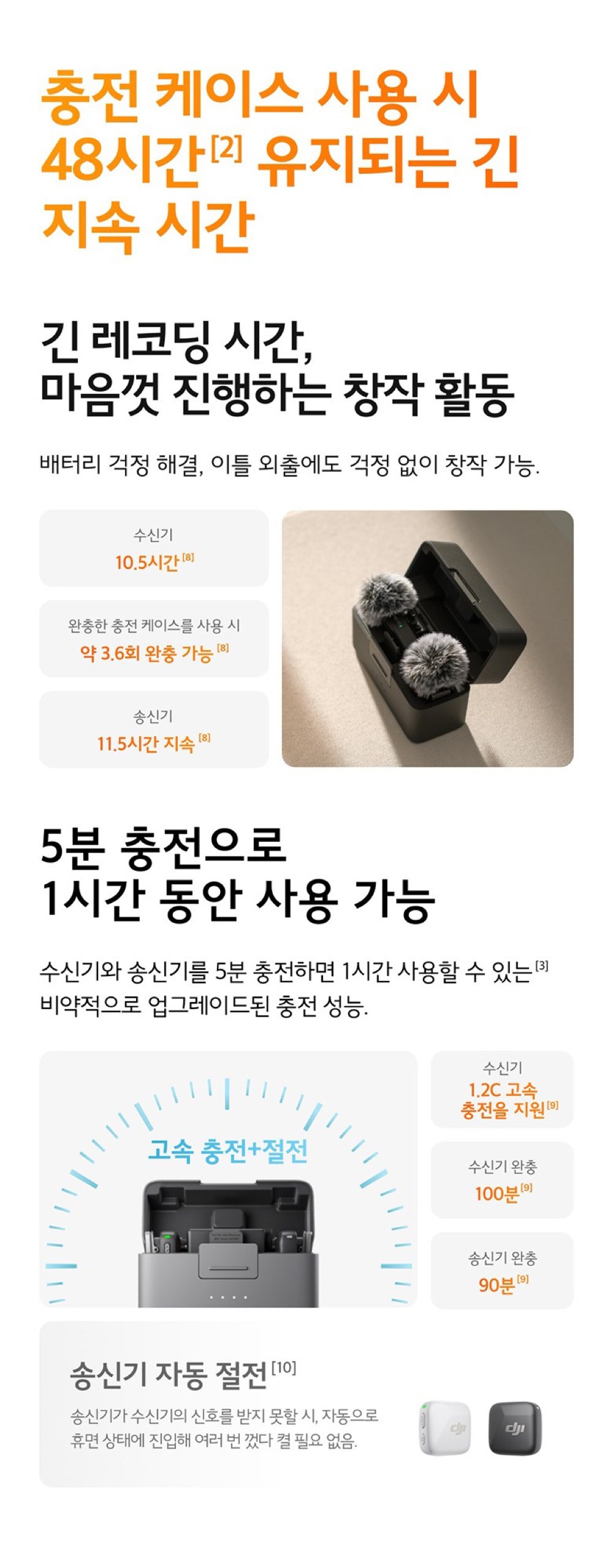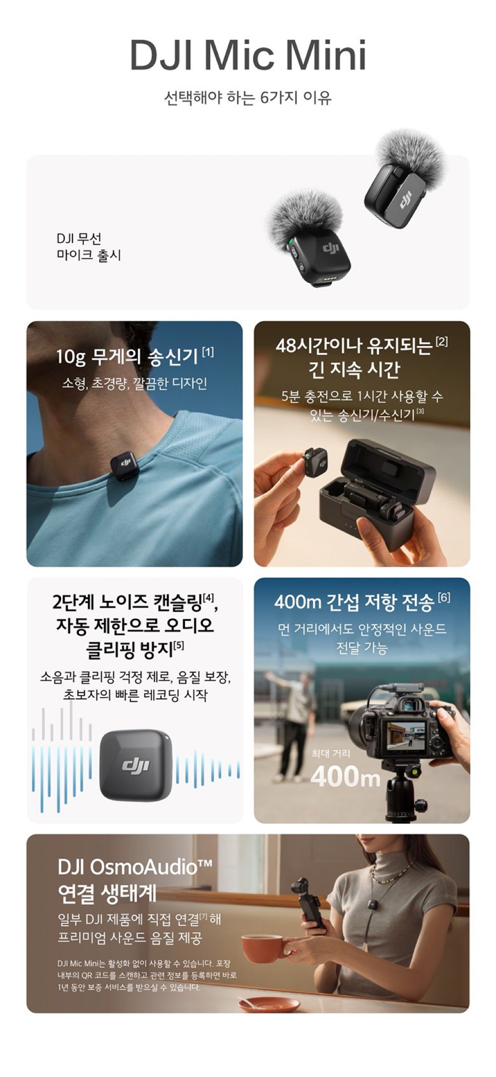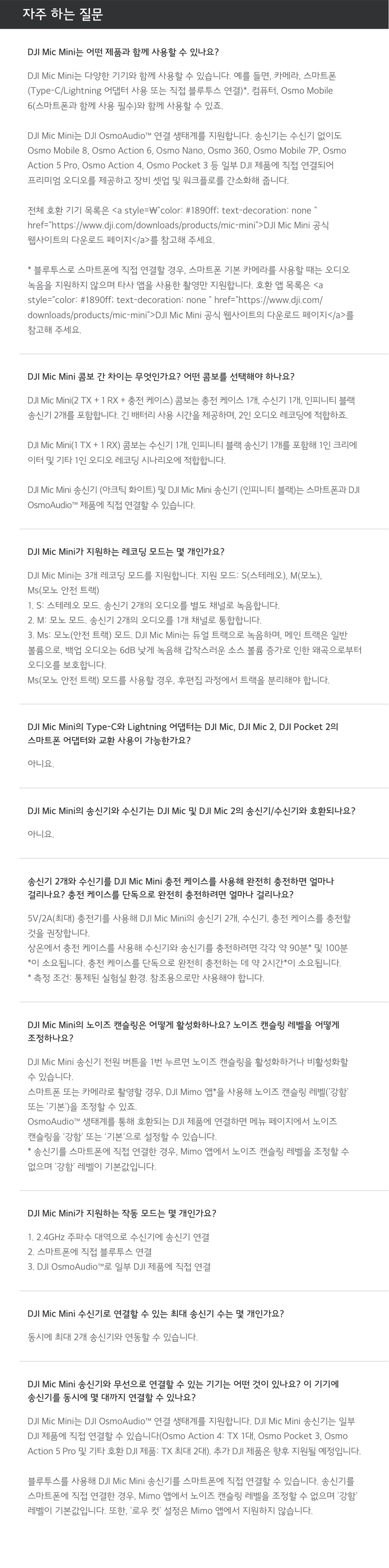- 구성품: 송신기(2개) + 수신기 + 충전 케이스 + 카메라 오디오 케이블 + 스마트폰 어댑터 + 충전 케이블 + 윈드스크린(블랙/그레이)(2개) + 윈드스크린(블랙)(2개) + 클립 마그넷(2개) + 운반 백