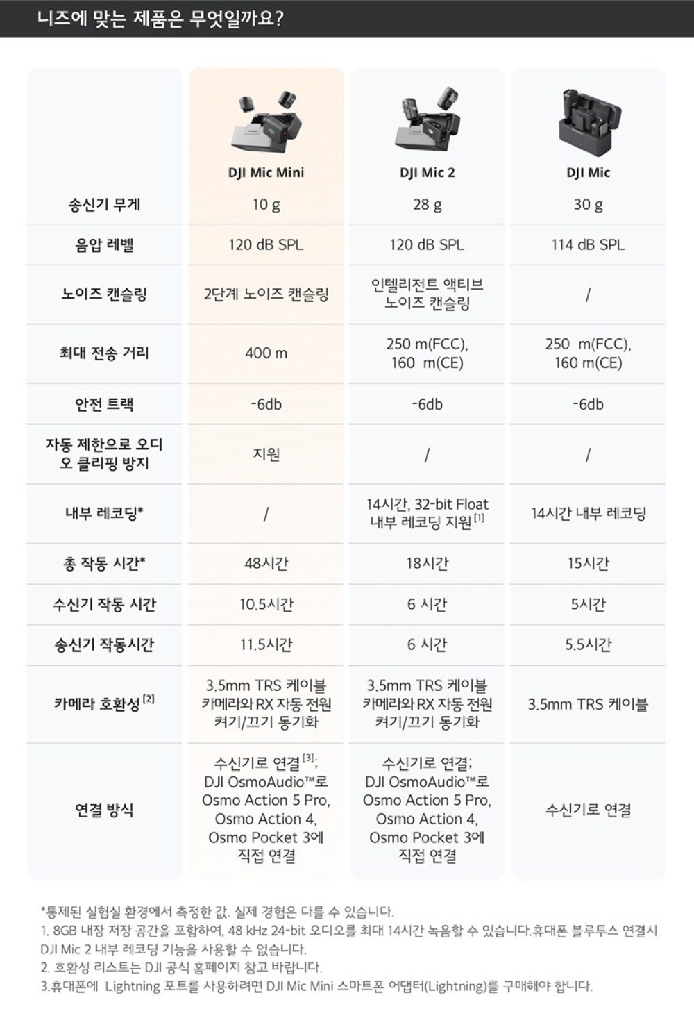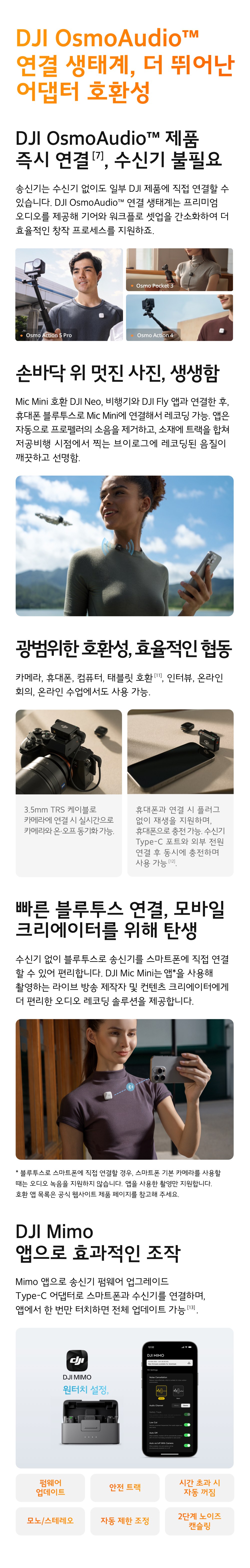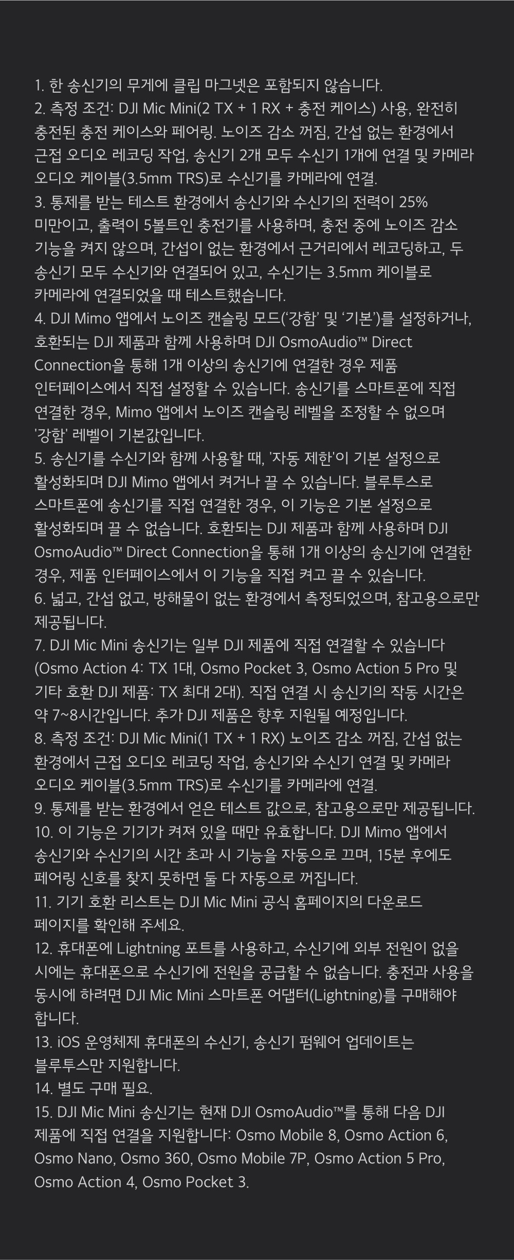 | 품명 및 모델명 | DJI Mic Mini 2 TX + 1 RX + 충전 케이스 무선 마이크 세트 / DMMR01(수신기)+DMMT01(송신기) | KC 인증정보 | 수신기: R-C-osm-DMMR01/ 송신기 : R-C-osm-DMMT01/ 수신기 전지 : YU101765-24010 / 송신기 전지 : YU101765-24011/ 충전케이스 전지 : YU10204-24002 |