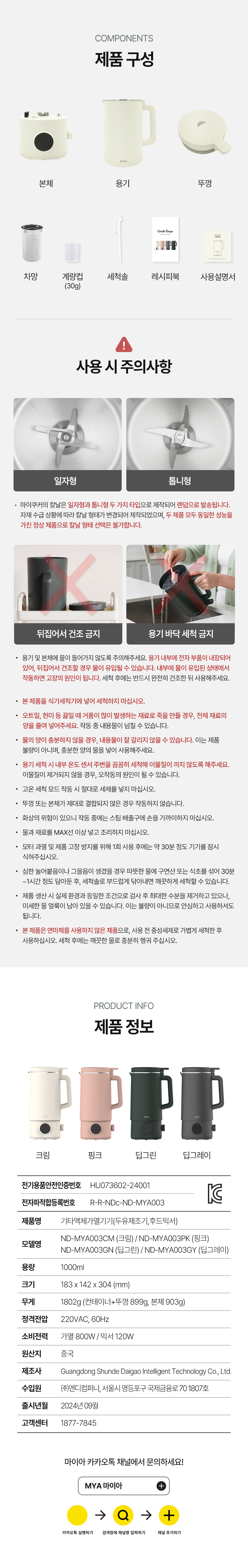 | 품명 및 모델명 | 마이아 마이쿠커 / ND-MYA003CM | KC 인증정보 | HU073602-24001 / R-R-NDc-ND-MYA003 |