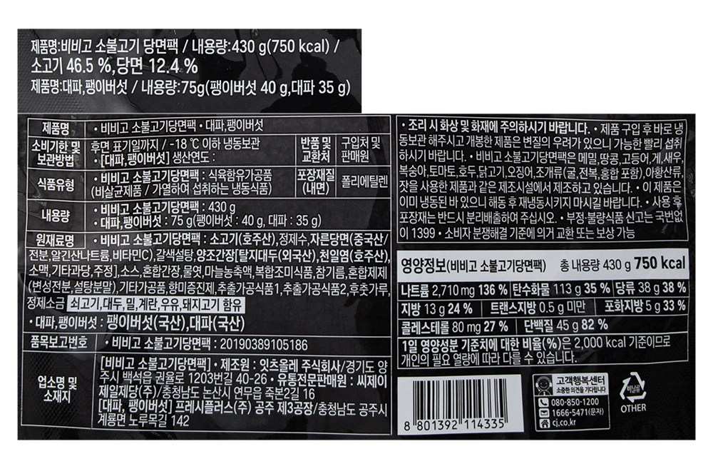 | 제조연월일, 소비기한 또는 품질유지기한 | 업데이트 예정 | 세부 품목군별 표시사항 | [ 대파, 팽이버섯 ] 농수산물 : 유전자변형(해당 없음) / 지리적 표시사항(해당 없음) | [ 비비고 소불고기 당면팩 ] 해당없음 |
