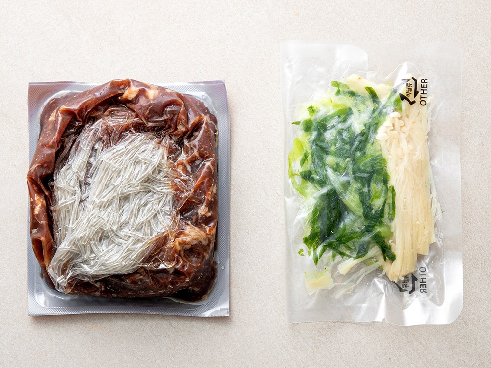 소불고기당면팩, 대파, 팽이버섯으로 구성되어 있습니다.