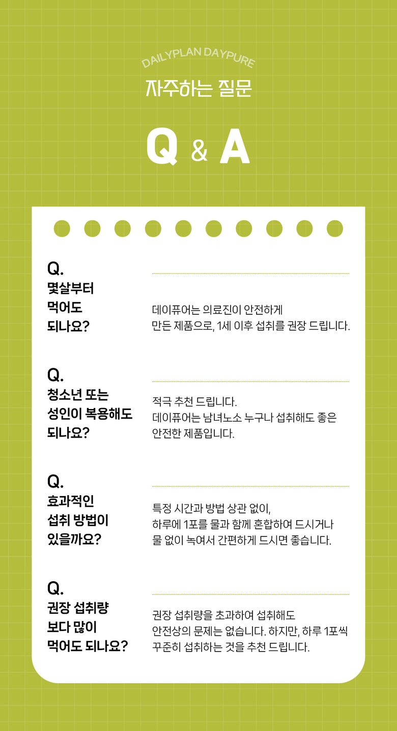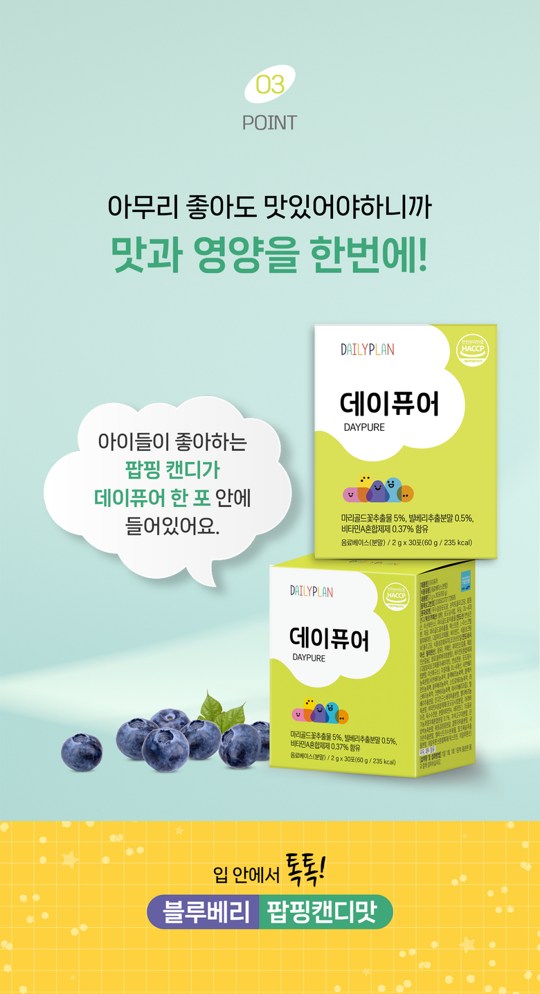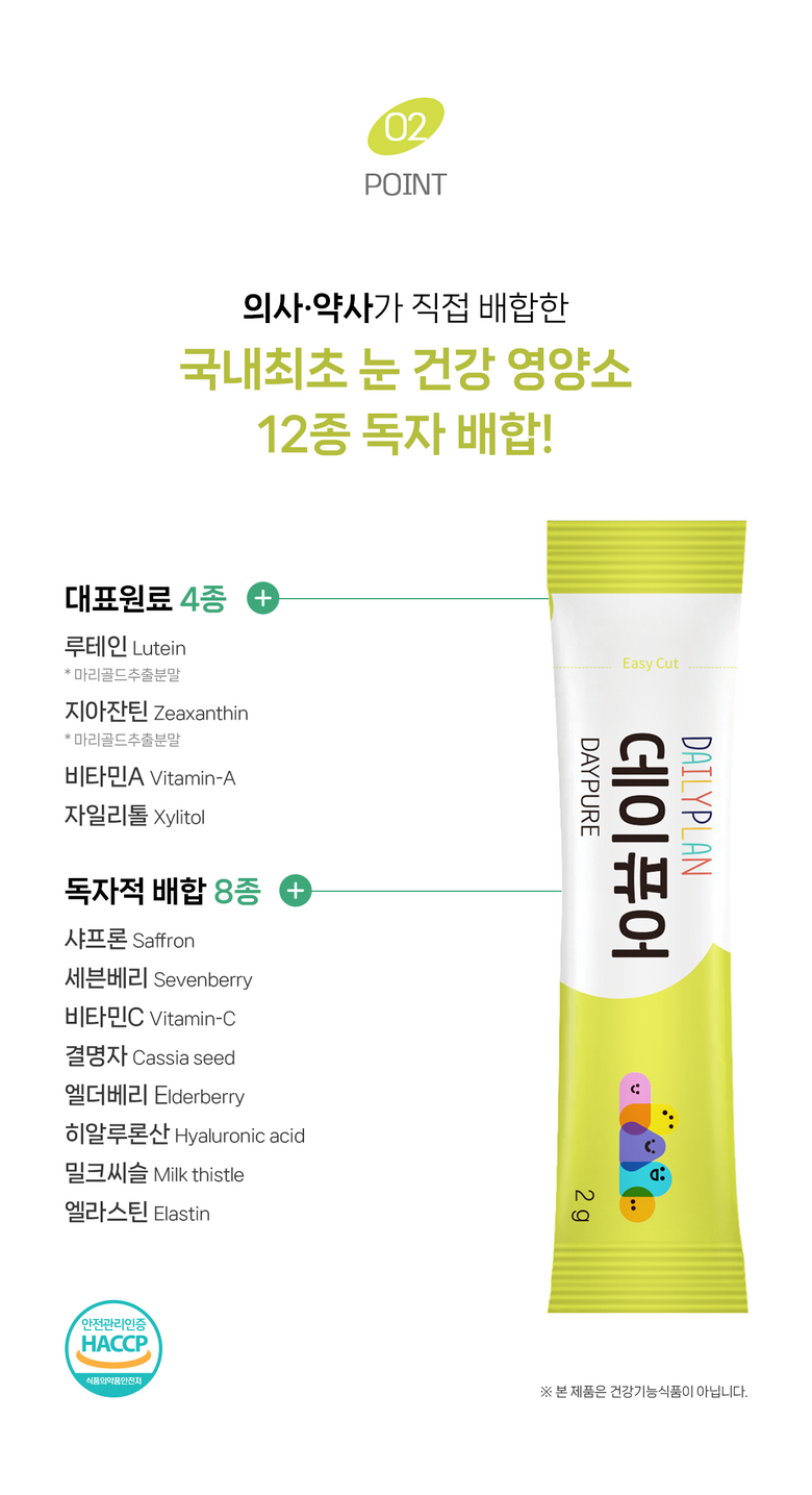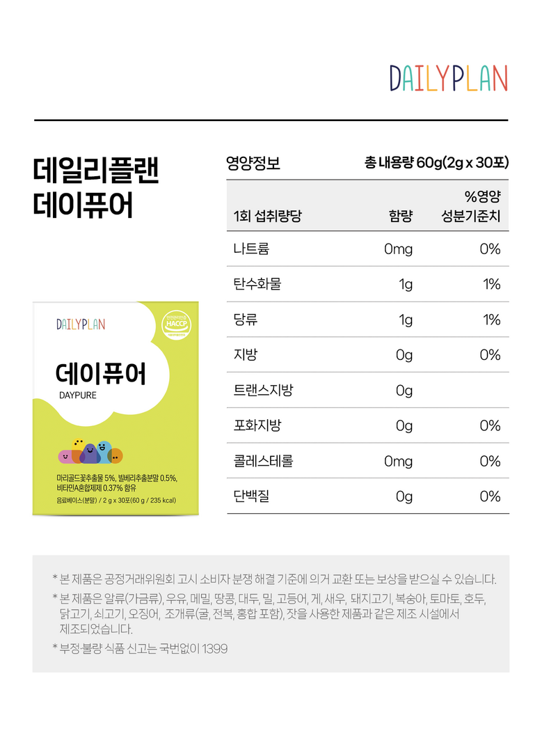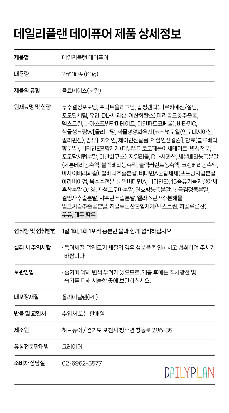 | 품목 또는 명칭 | 데일리플랜 데이퓨어 | 포장단위별 내용물의 용량(중량),수량,크기 | 2g x 30포 |