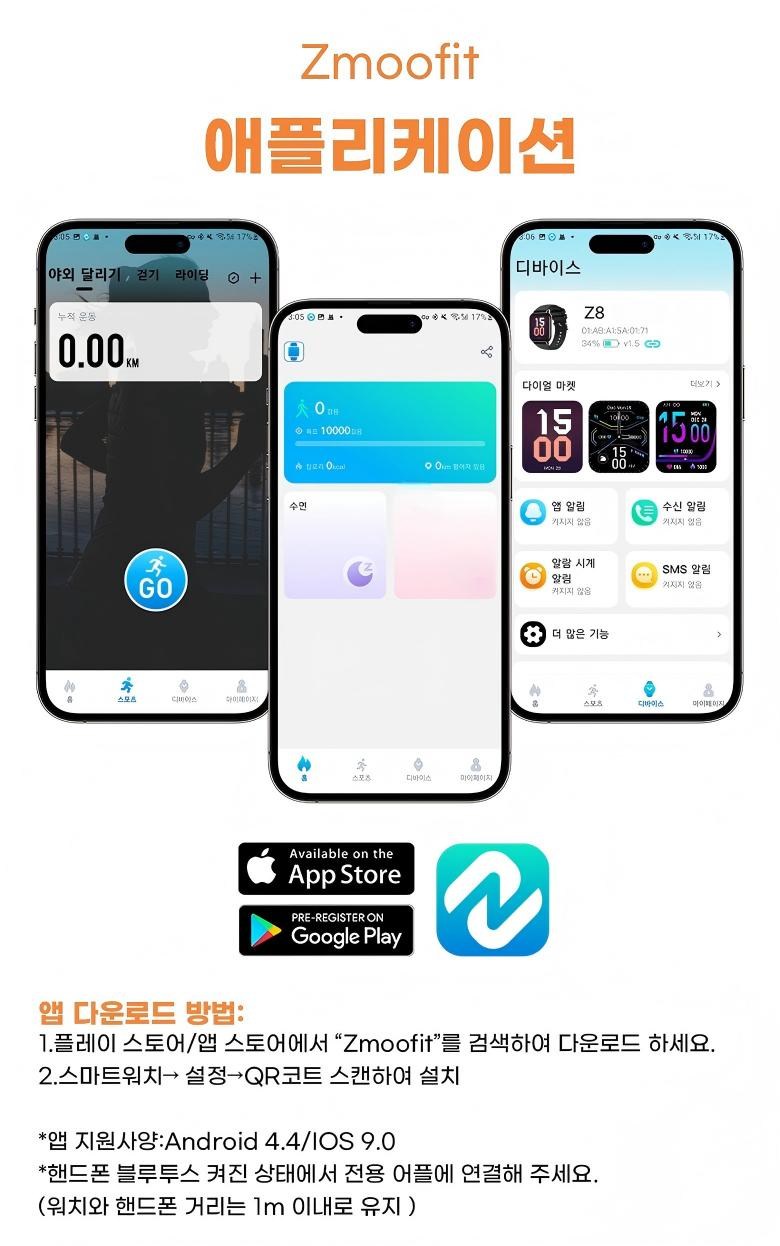제품을 받으신 후 우선적으로 전용 앱"Zmoofit"를 다운로드 하여 설치하세요.