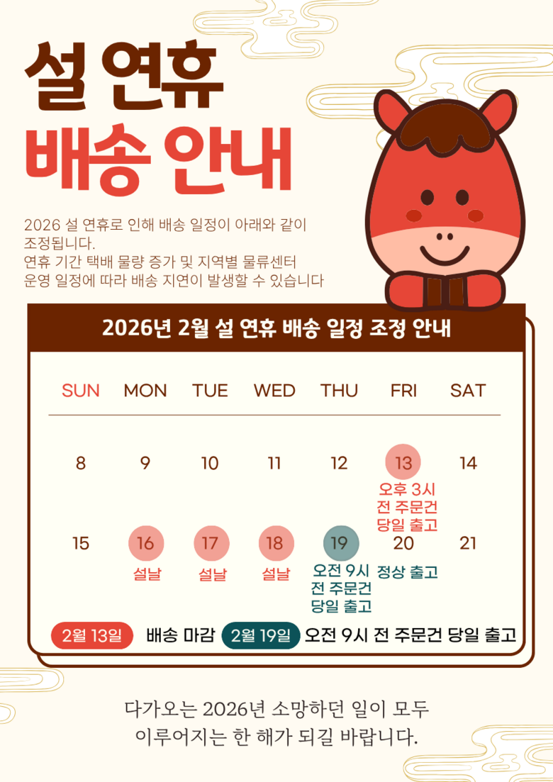 | 배송기간 | ㆍ도서산간 지역 등은 배송에 3-5일이 더 소요될 수 있습니다. - 천재지변, 물량 수급 변동 등 예외적인 사유 발생 시, 다소 지연될 수 있는 점 양해 부탁드립니다. | ||