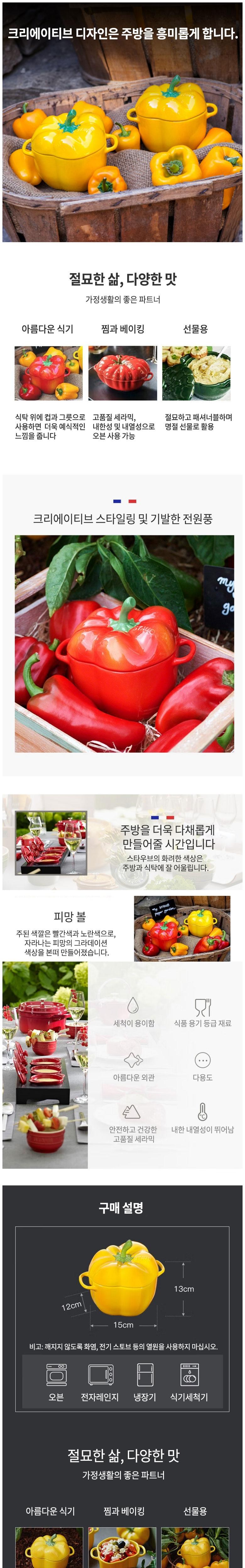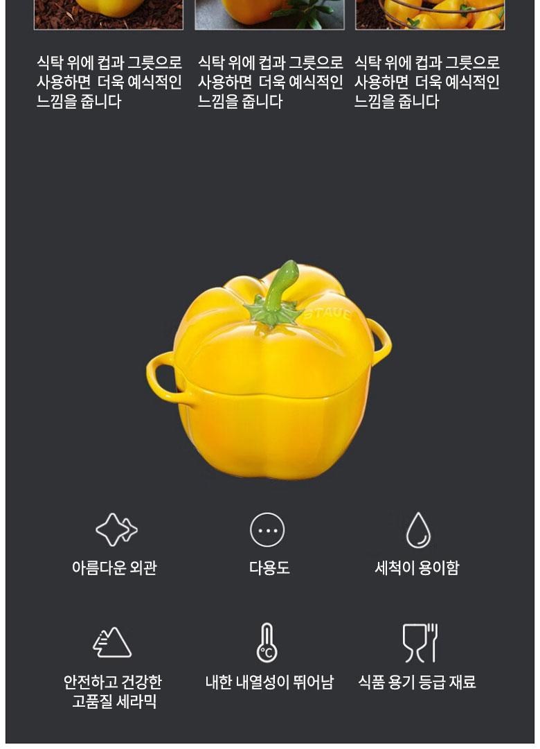 직화 조리 금지 이 제품을 직접 화염, 전기레인지, 전기 히터 등 직접적인 열원 위에서 조리하지 마십시오. 균열이 생길 수 있습니다. 화상 주의 도자기 제품은 조리 후(직화 금지) 뜨거울 수 있으니 방열 장갑을 사용해 다루시기 바랍니다. 또한 어린이의 화상을 조심하십시오. 급격한 온도 변화 방지 고온 상태에서 제품을 바로 찬물에 헹구거나 냉장고에 넣지 마십시오. 자연적으로 식힌 후 세척하거나 냉장 보관해 주세요. 충격 주의 도자기 그릇은 깨지기 쉬우므로 싱크대에 세게 던지지 마십시오. 기타 STAUB 식기는 수작업으로 제작된 도자기 제품으로, 유약이 고르지 않거나 일부 결함이 있을 수 있으나 이는 정상적인 사용에 영향을 미치지 않습니다.
