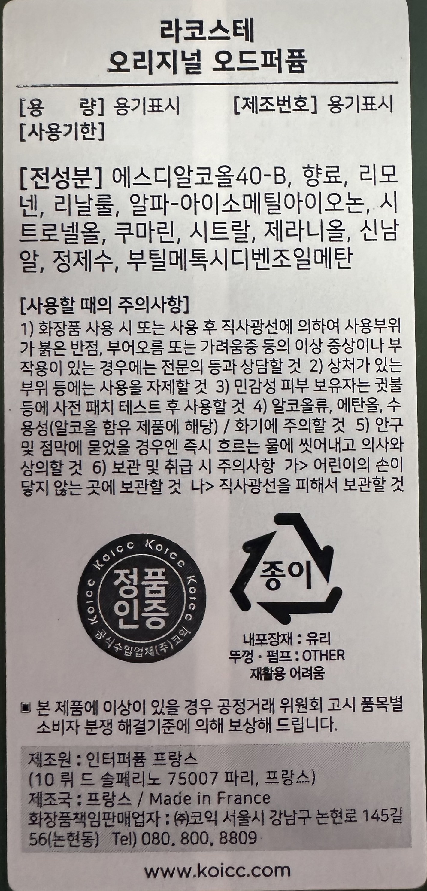 | 화장품제조업자, 화장품책임판매업자 및 맞춤형화장품판매업자 | 컨텐츠 참조 | 제조국 | 프랑스 |