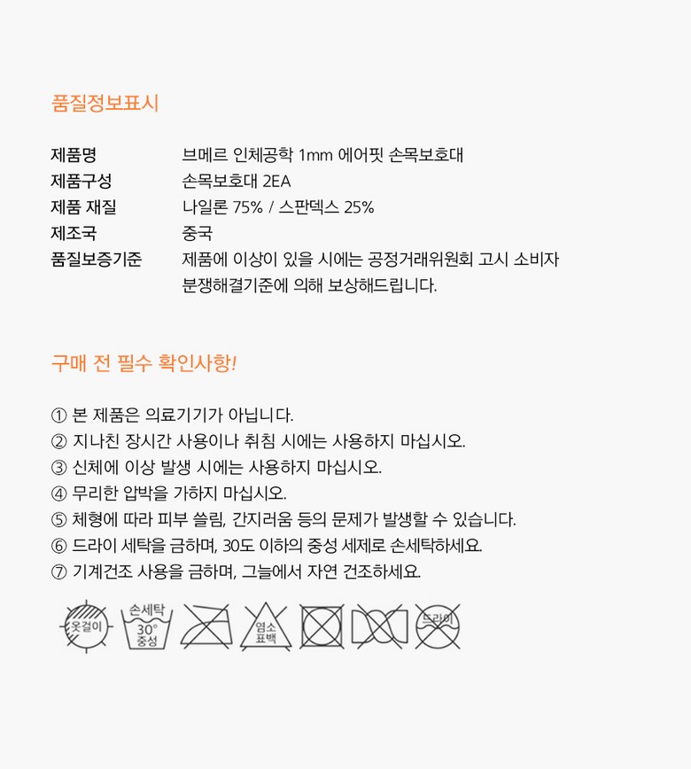 | 품명 및 모델명 | 브메르 1mm 에어핏 손목보호대 | 인증/허가 사항 | 해당사항 없음 |