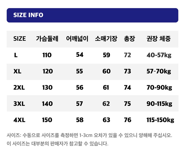 | 치수 | L,XL,2XL,3XL,4XL | 제조자(수입자) | 구미쿠미 주식회사 |