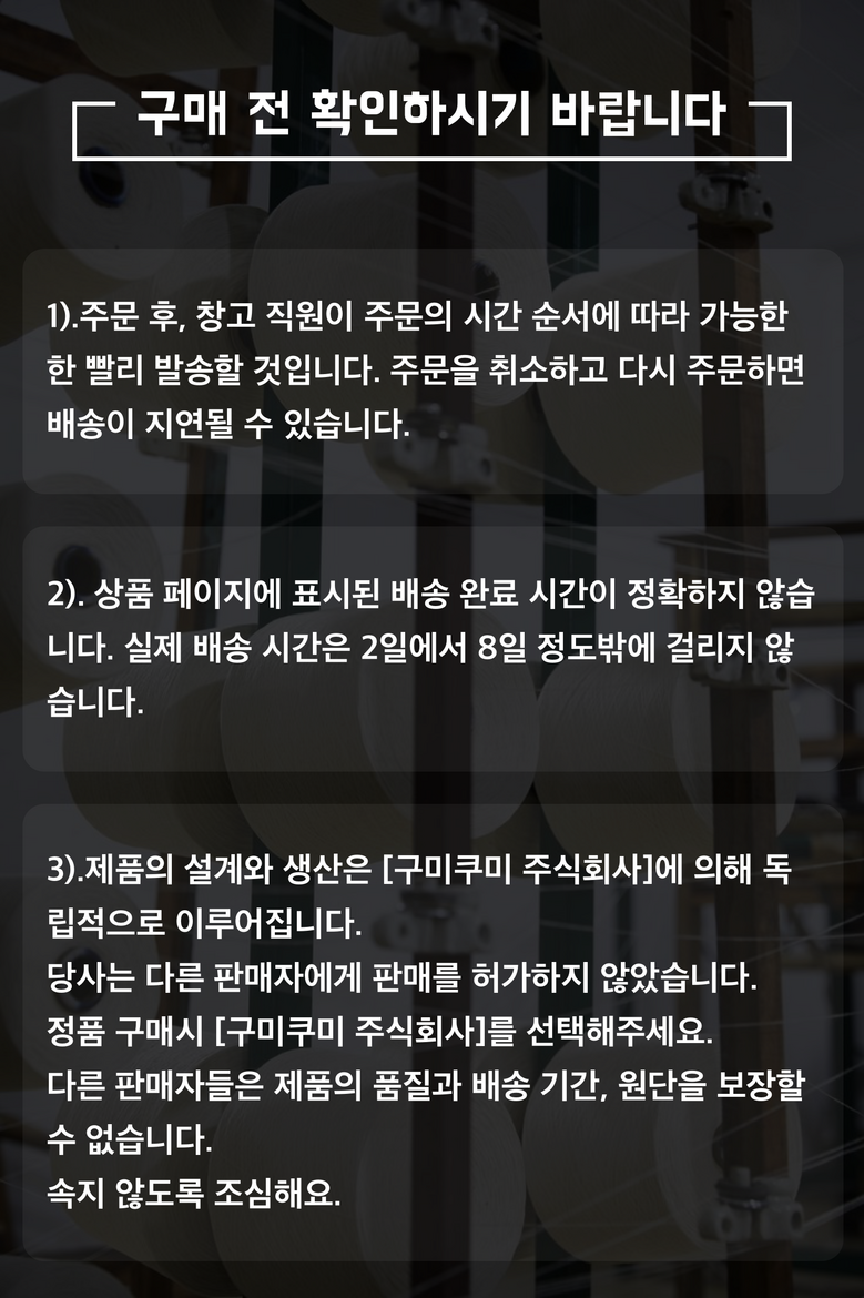 - ㆍ모니터 해상도의 차이로 인해 색상이나 이미지가 실제와 달라, 고객이 단순 변심으로 교환/반품을 무료로 요청하는 경우