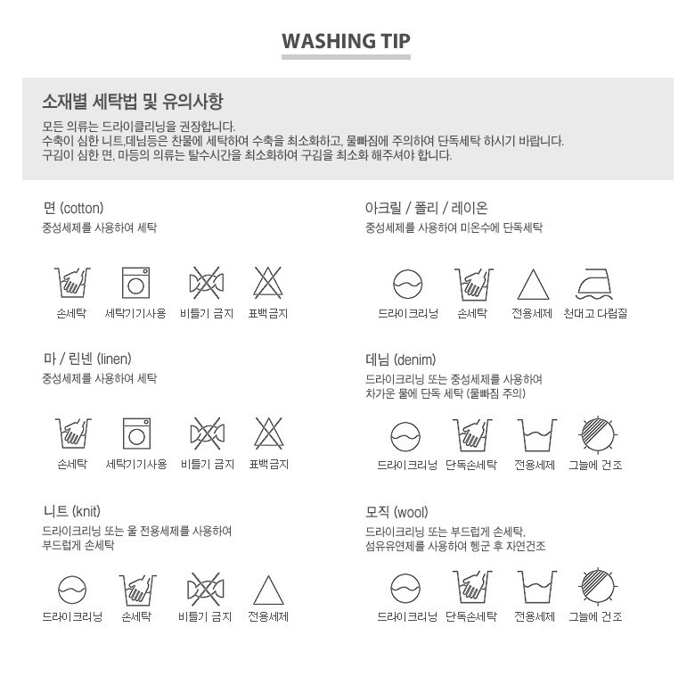 | 제조국 | 상품 상세페이지 참조 | 세탁방법 및 취급시 주의사항 | tips.중성 세제에 식초를 넣으면 옷의 색이 빠지는 것을 방지하고 변형을 예방할 수 있습니다. |