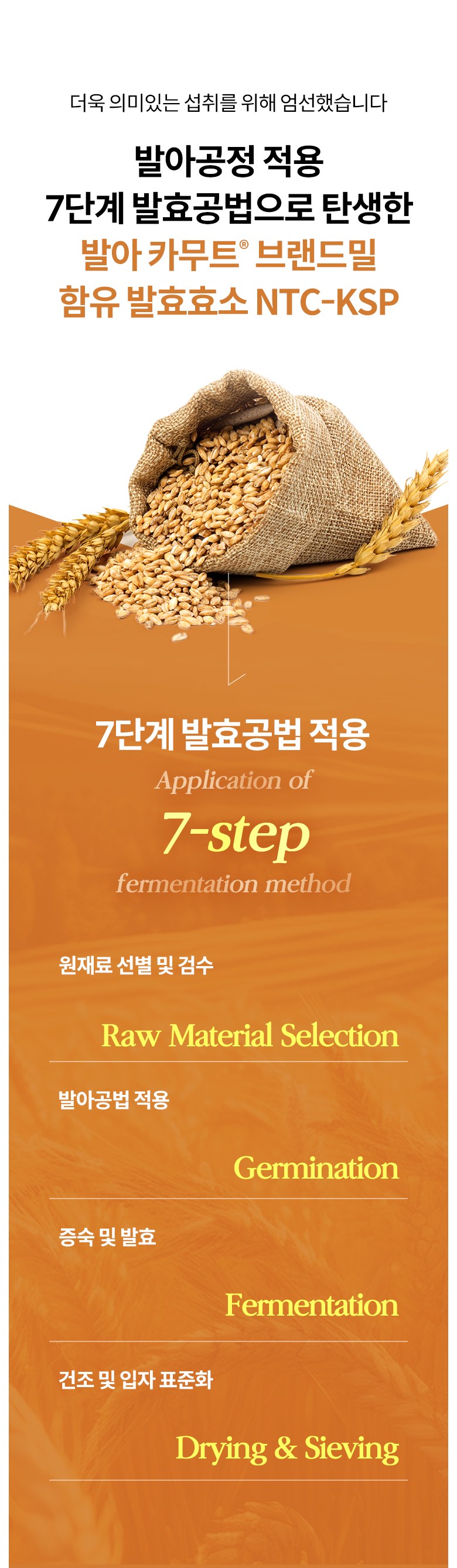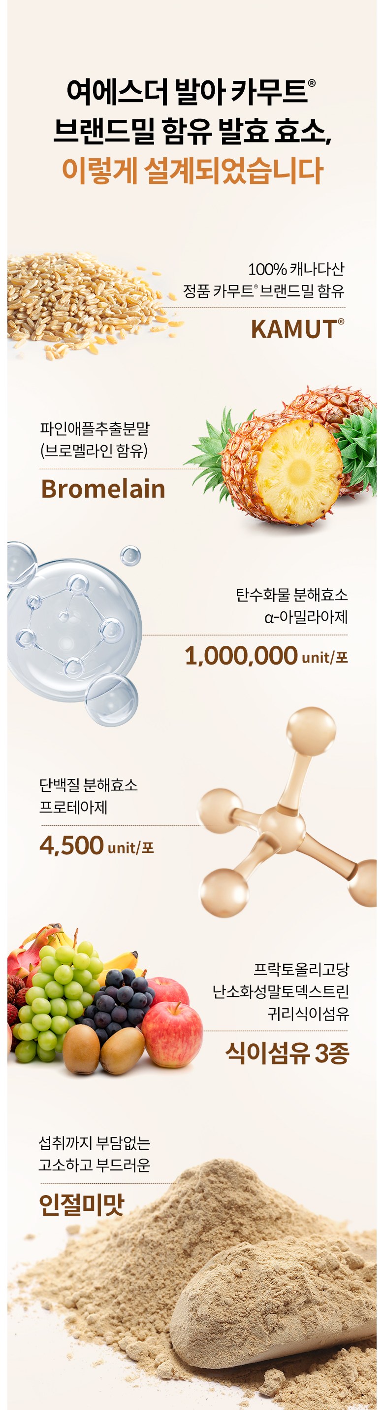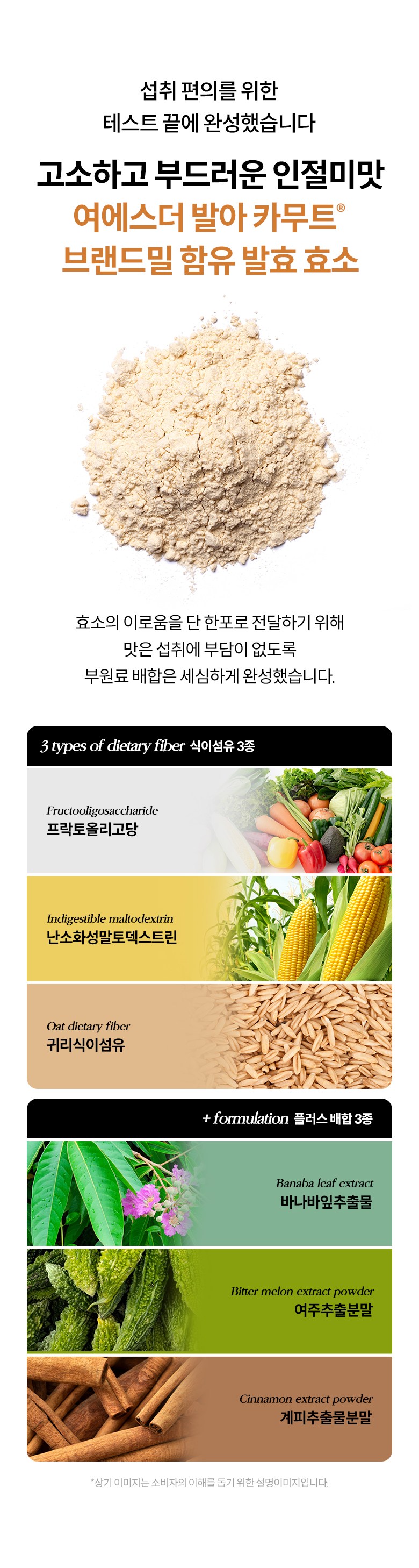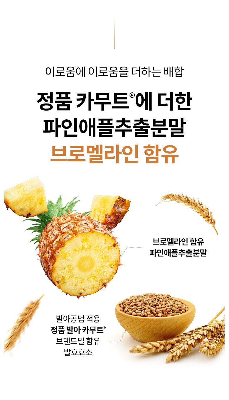 | 원재료명 및 함량 | 발아 카무트®브랜드밀 함유 발효효소 NTC-KSP{카무트® 브랜드 호라산 밀(밀: 캐나다산), 곡류혼합분말(보리: 국산), Aspergillus oryzae, Bacillus subtilis, Lactiplantibacillus plantarum}, 볶음콩혼합분말_에리스리톨{대두(미국산), 에리스리톨, 옥수수(외국산/브라질, 호주, 우즈베키스탄), 정제소금}, 프락토올리고당, 제삼인산칼슘, 대나무수액추출분말(인도산), 난소화성말토덱스트린, 혼합제제(덱스트린, 변성전분, 주정, 합성향료, 트리아세틴, 프로필렌글리콜), 효소처리스테비아, 바나바잎추출분말, 여주추출분말, 귀리식이섬유, 파인애플추출분말(브로멜라인 함유), 계피추출분말 | 영양성분 | 상품 상세페이지 참조 |