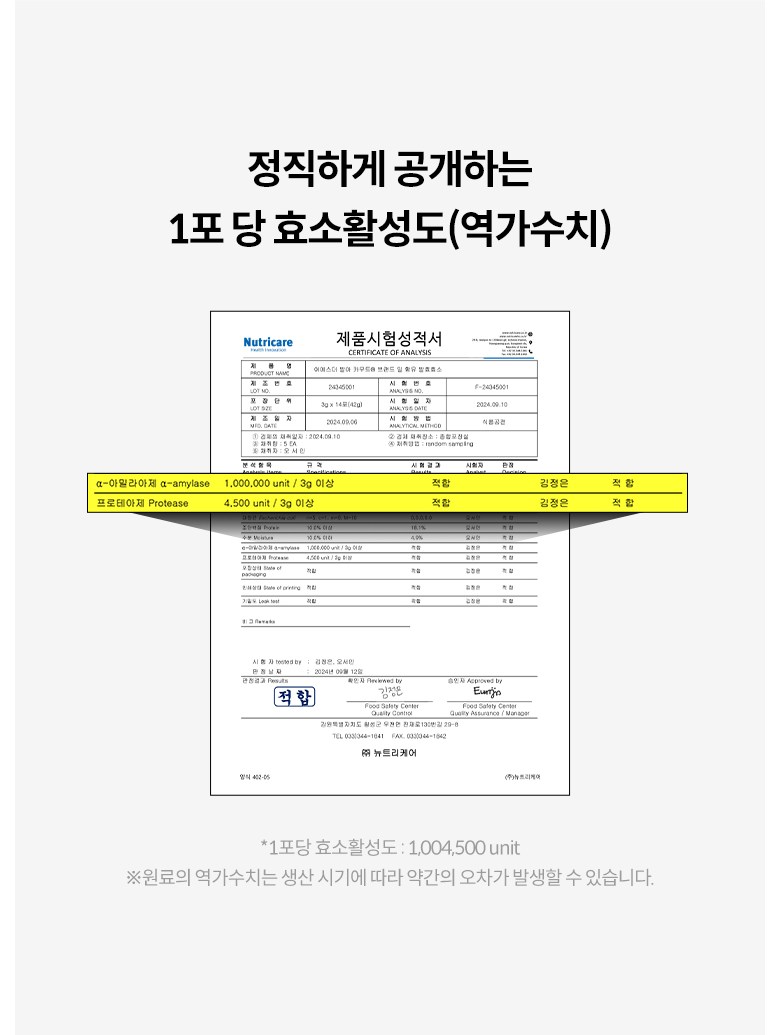 | 식품의 유형 | 효소식품 | 생산자/소재지(수입품의 경우 생산자, 수입자 및 제조국) | (주)뉴트리케어 1공장 / 강원특별자치도 횡성군 우천면 전재로 130번길 29-26 |