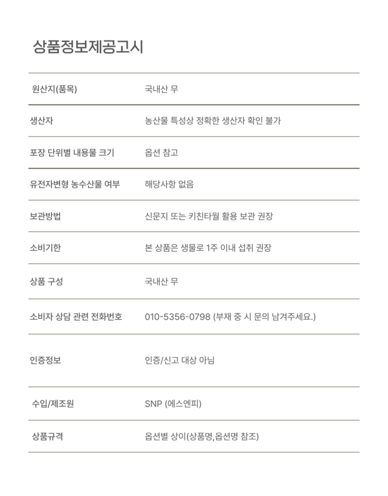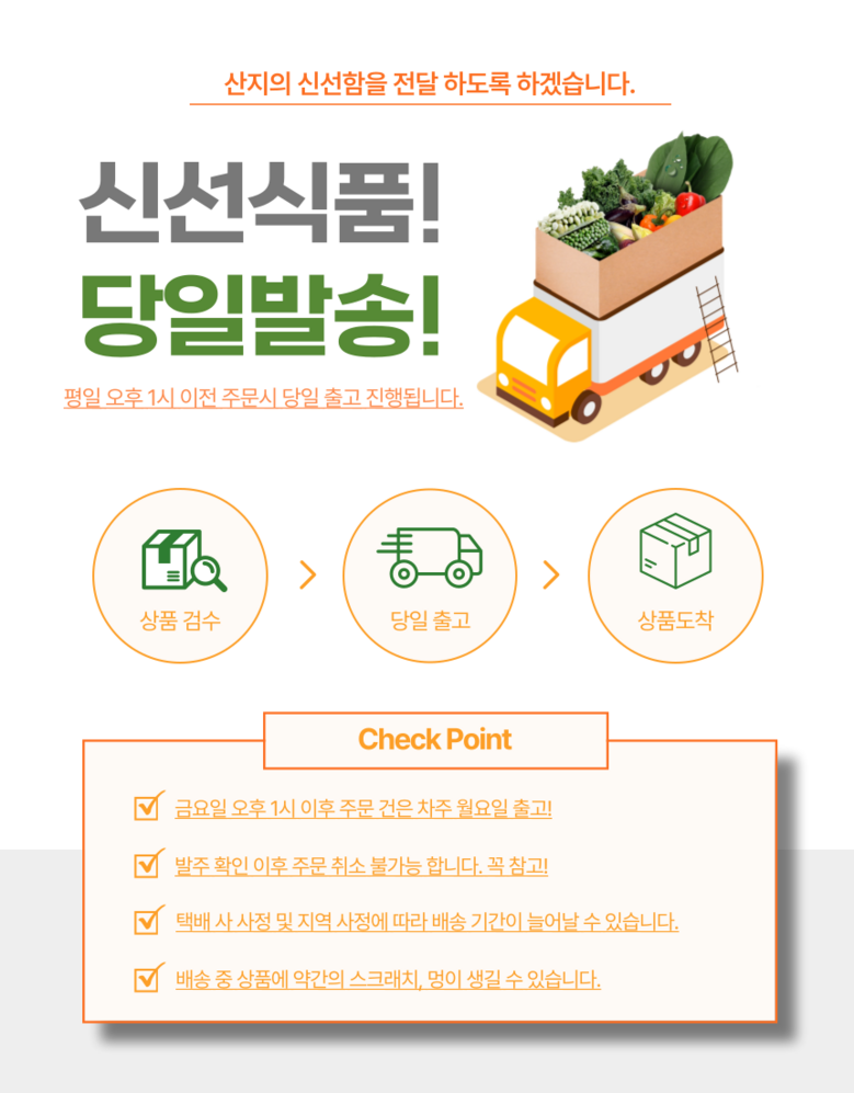 | 배송방법 | 신선/냉장/냉동 | 배송비 | 무료배송 - 도서산간 지역 배송불가 |