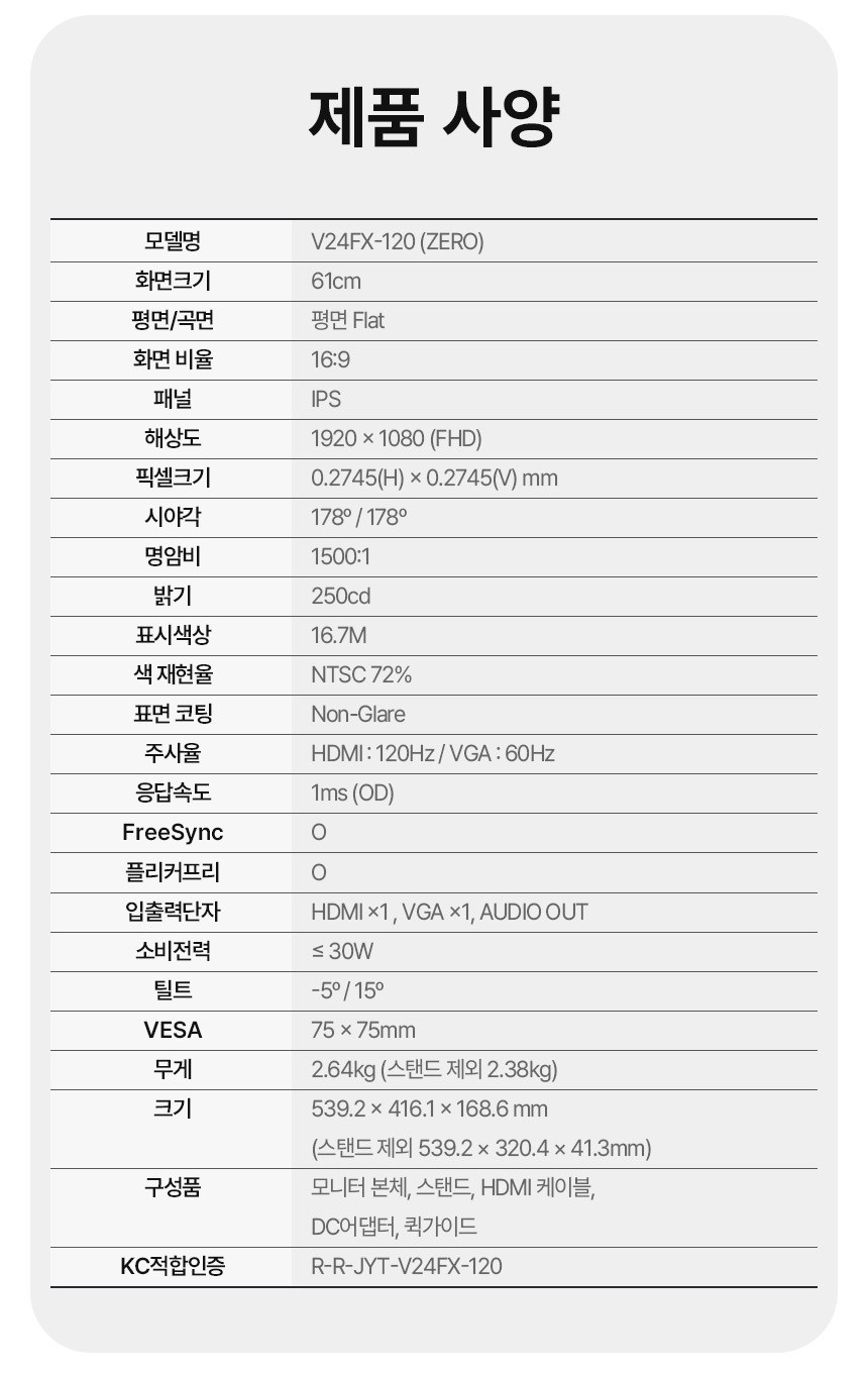 | 품명 및 모델명 | 주연테크 FHD V24FX-120 120Hz 모니터, 61cm, V24FX-120(무결점) / 판매모델명: V24FX-120(ZERO) , 인증모델명 : V24FX-120 | KC 인증정보 | 본품:R-R-JYT-V24FX-120 , 전원: SU10709-21001 |