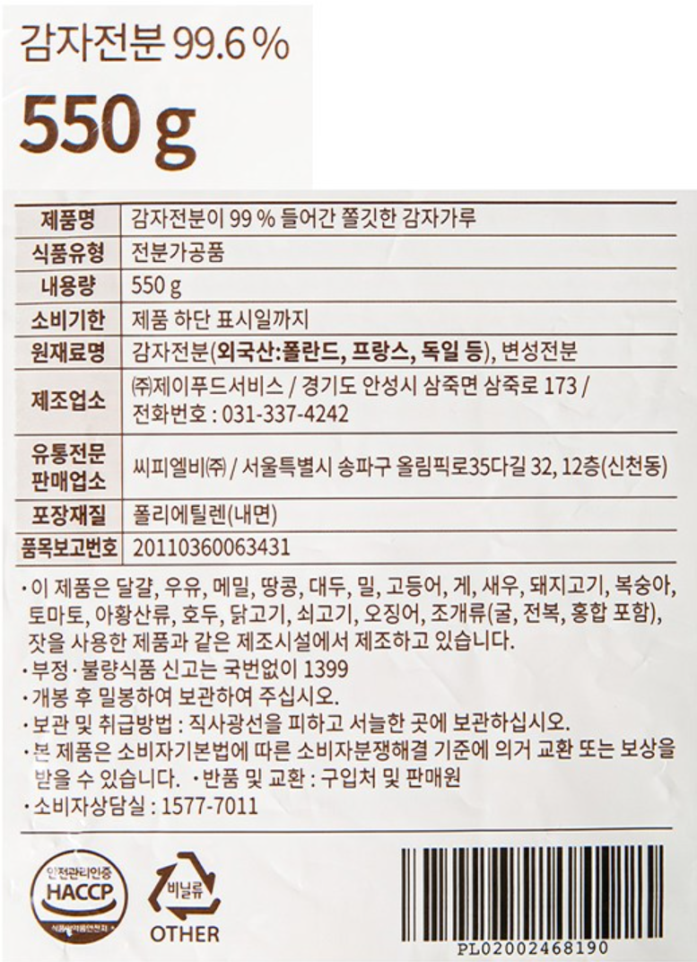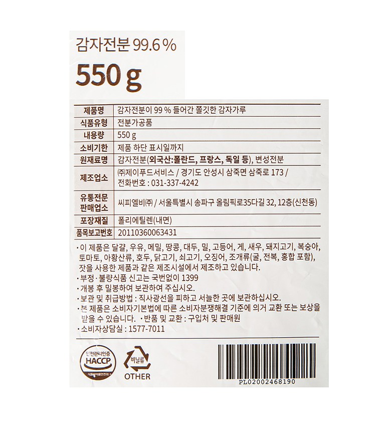 | 제품명 | 감자전분이 99% 들어간 쫄깃한 감자가루 | 식품의 유형 | 컨텐츠 참조 |