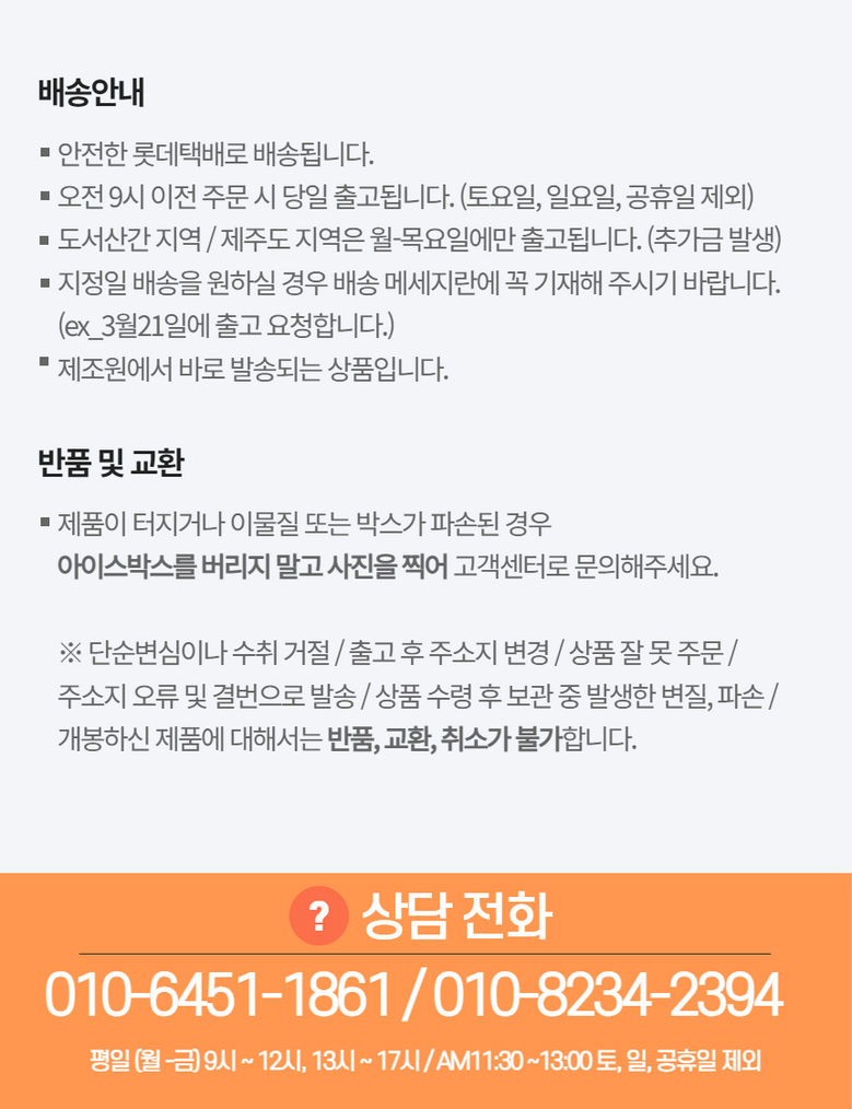 | 배송방법 | 신선/냉장/냉동 | 배송비 | 무료배송 - 도서산간 지역 배송불가 |