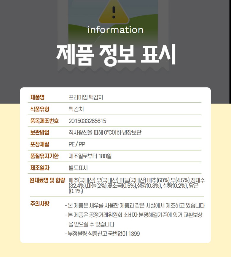 | 제조연월일, 소비기한 또는 품질유지기한 | 상품 상세페이지 참조 | 세부 품목군별 표시사항 | 상품 상세페이지 참조 |