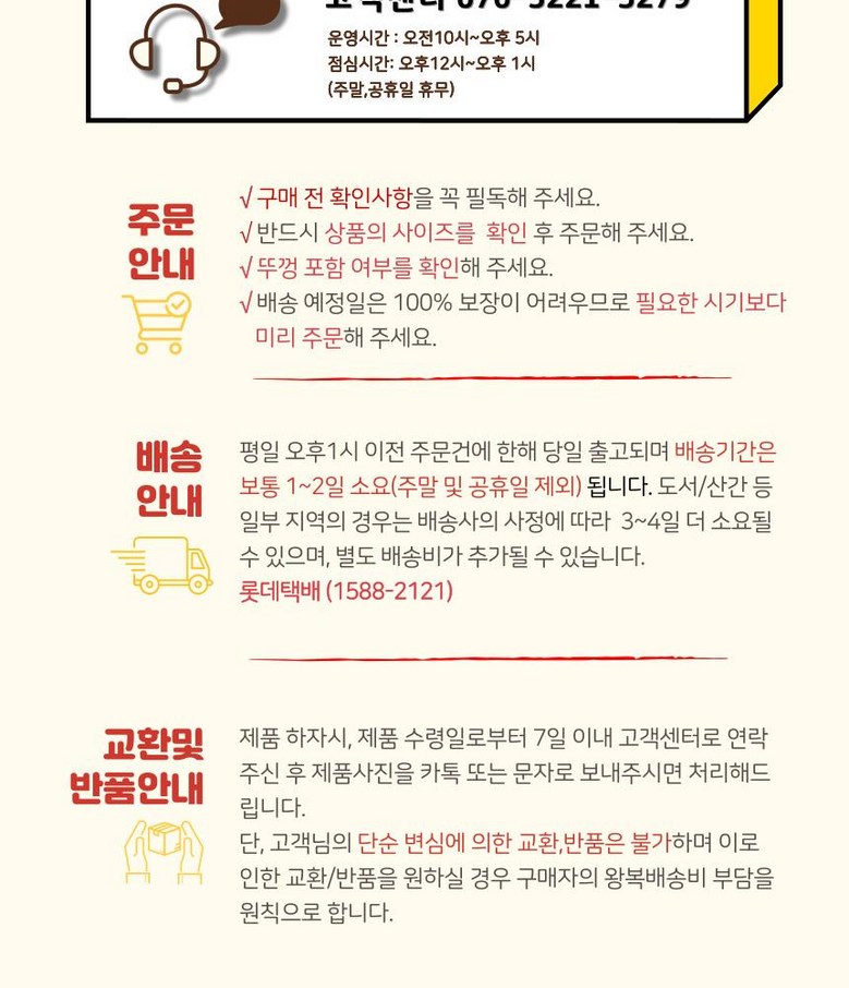 - ㆍ모니터 해상도의 차이로 인해 색상이나 이미지가 실제와 달라, 고객이 단순 변심으로 교환/반품을 무료로 요청하는 경우