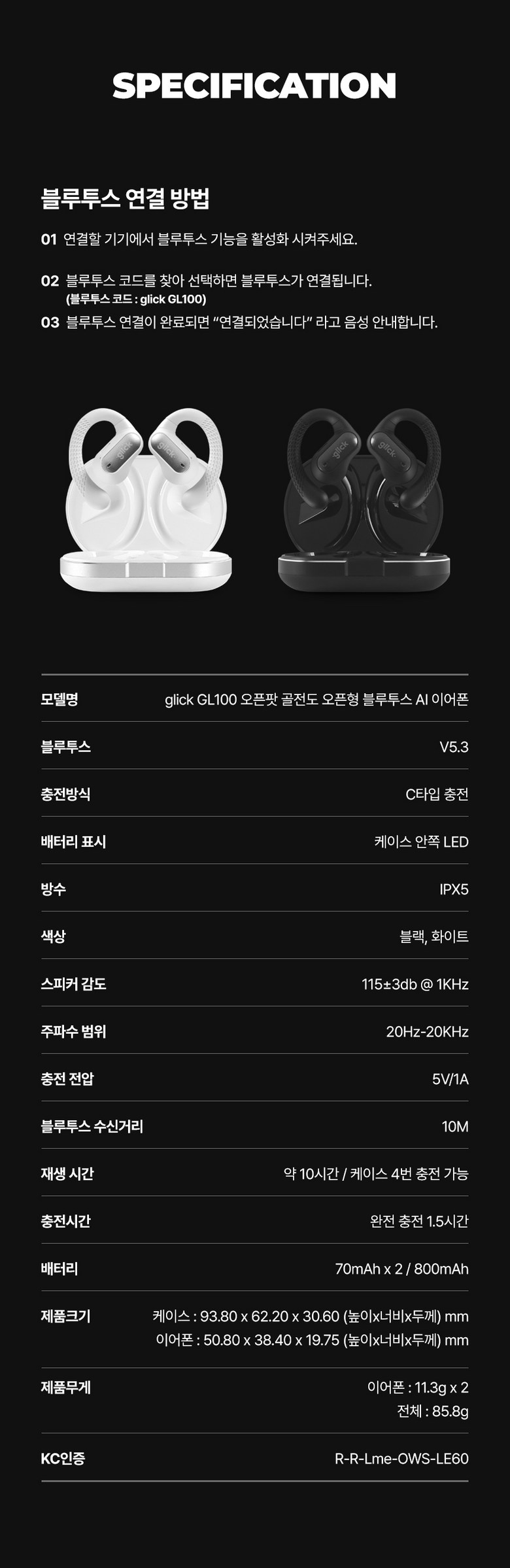 | 품명 및 모델명 | 지클릭커 glick 오픈팟 오픈형 블루투스 AI 이어폰 GL100 | KC 인증정보 | R-R-Lme-OWS-LE60 |