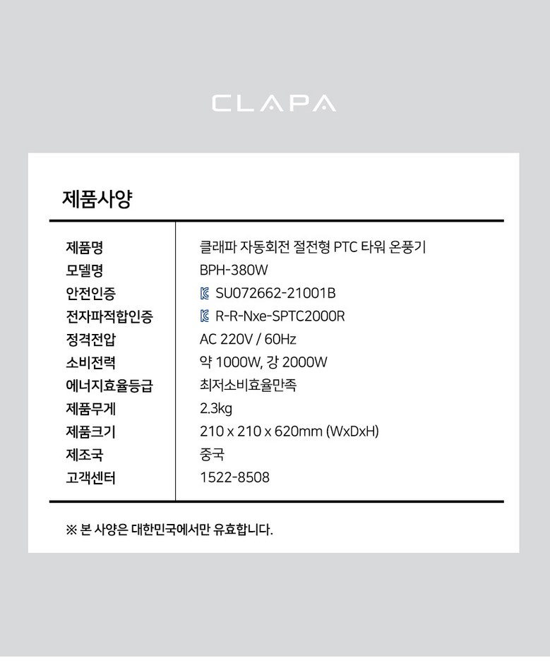 | 품명 및 모델명 | 클래파 온풍기 BPH-380W | KC 인증정보 | 상품 상세페이지 참조 |