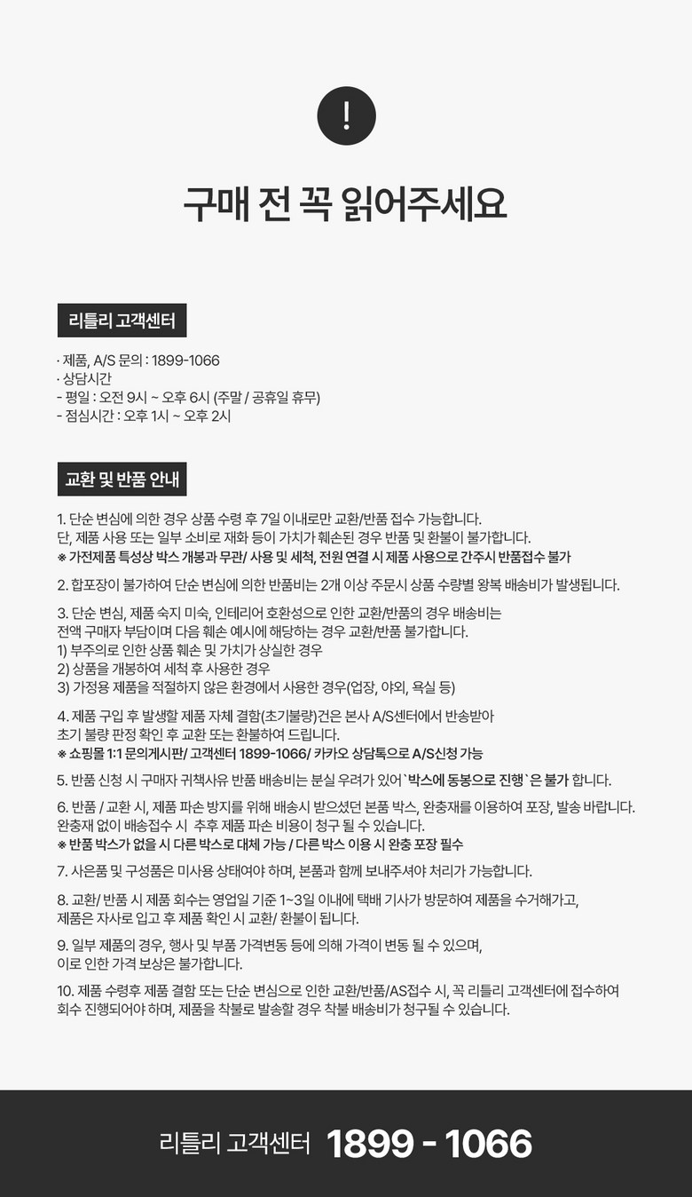 - ㆍ교환/반품에 관한 일반적인 사항은 판매자가 제시사항보다 관계법령이 우선합니다.
