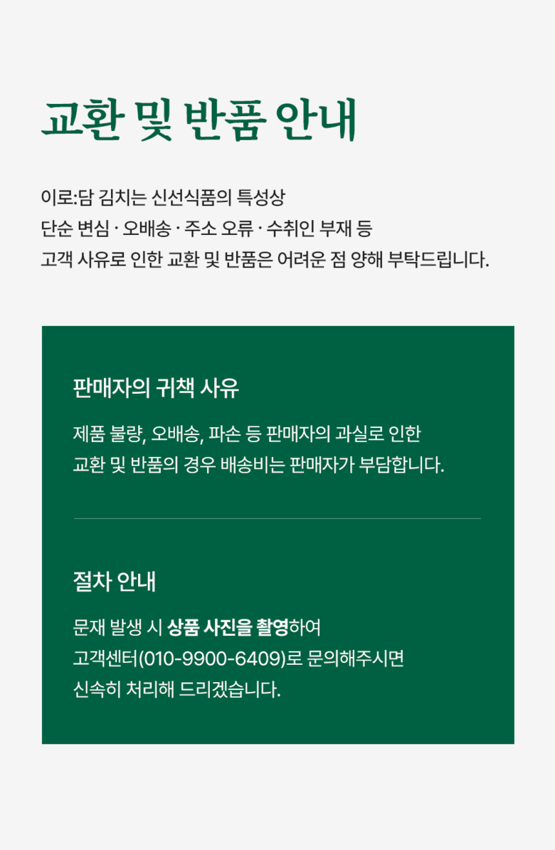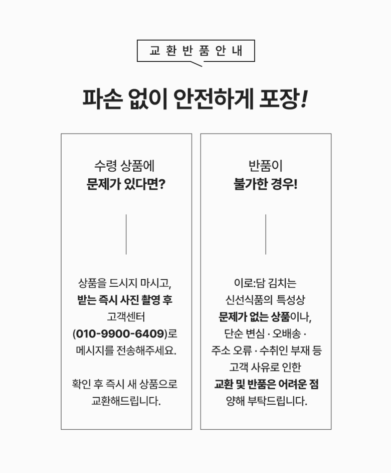 | 교환/반품 비용 (왕복비용) | 6,000원 - 단, 고객 변심의 경우에만 발생 - 도서산간 지역 배송불가 |