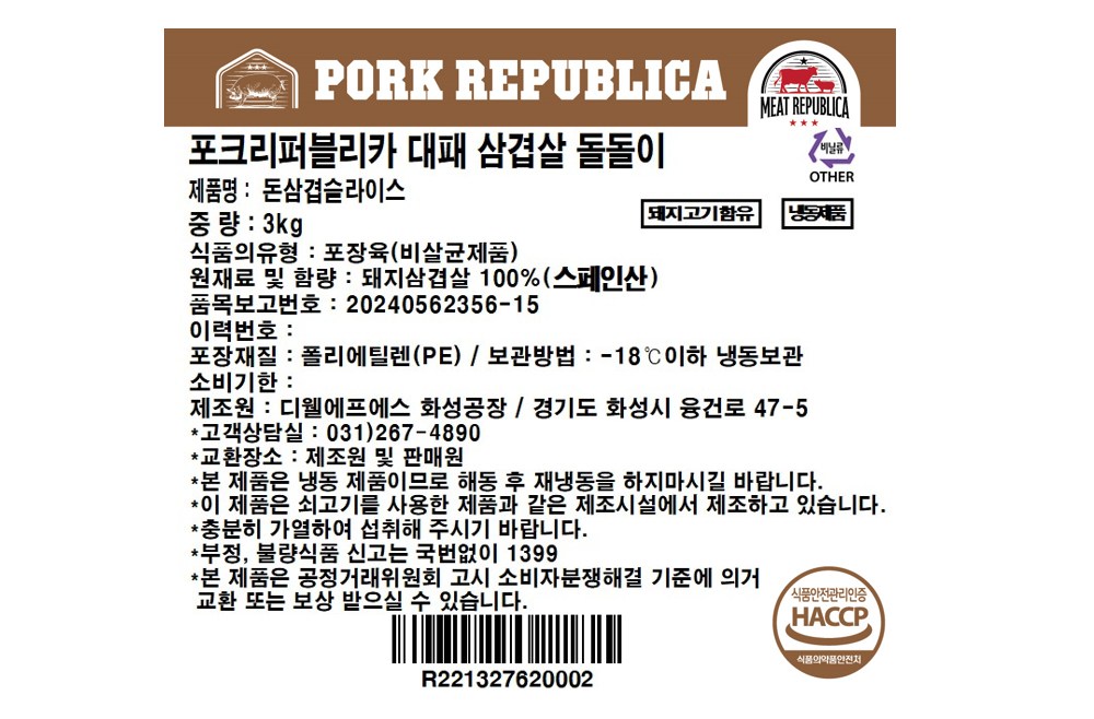 | 제조연월일, 소비기한 또는 품질유지기한 | 소비기한(또는 유통기한) : 2026년 12월 17일 이거나 그 이후인 상품 제조년월일 : 2025년 12월 18일 이후인 제조상품 | 세부 품목군별 표시사항 | 축산물 등급표시 : 해당 없음 / 이력번호 표시유무 : 이력번호 표시제품임 |