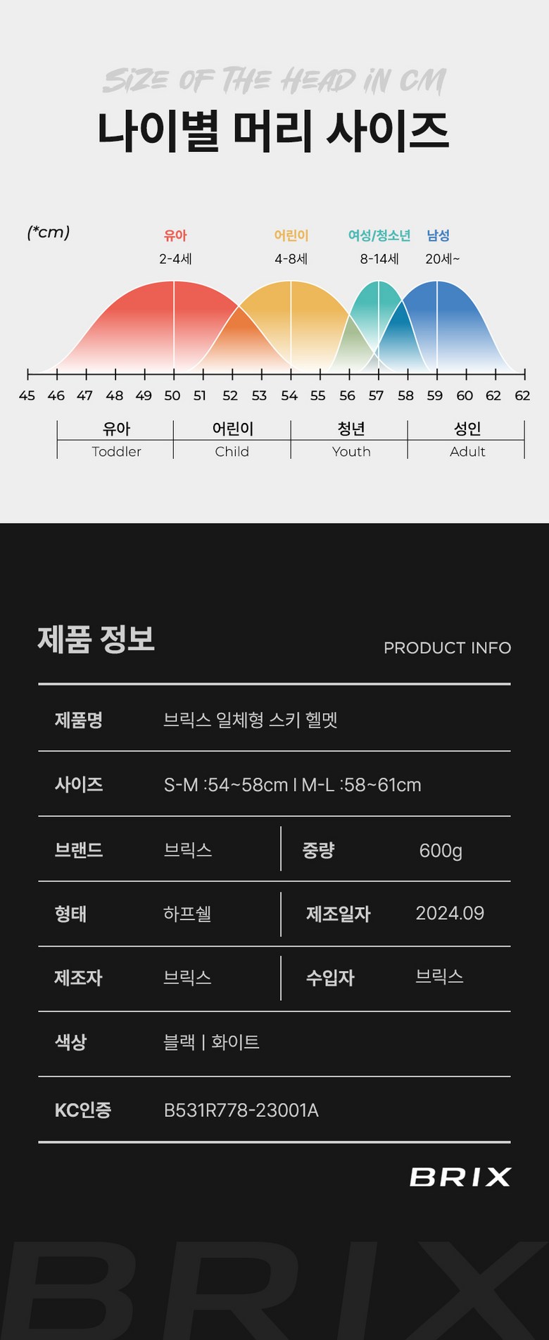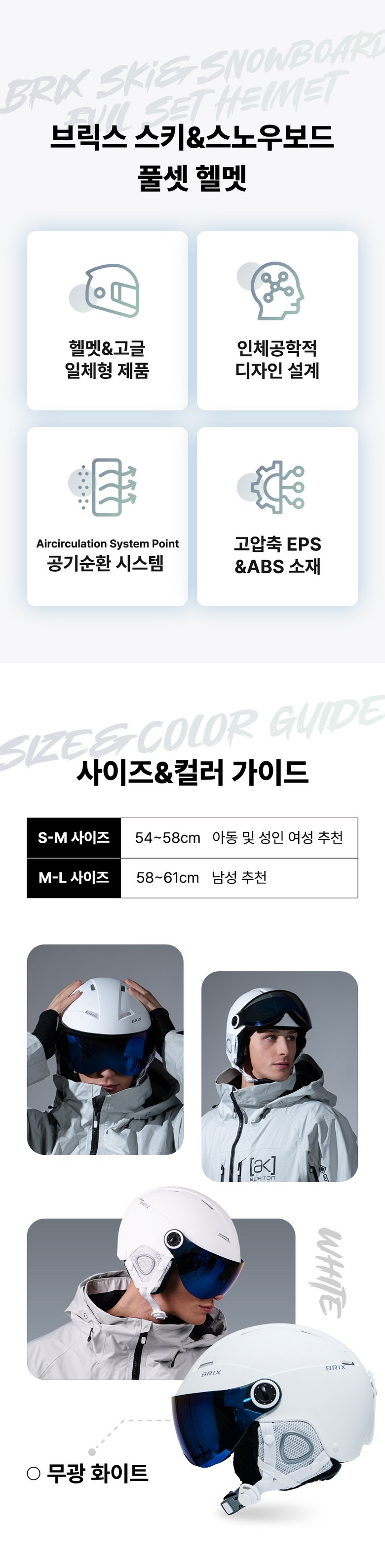 | 크기, 중량 | S-M : 54~58cm (600g) M-L : 58~61cm (600g) | 색상 | 블랙,화이트 |