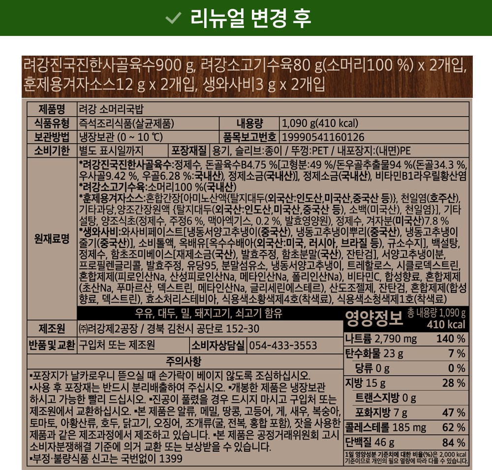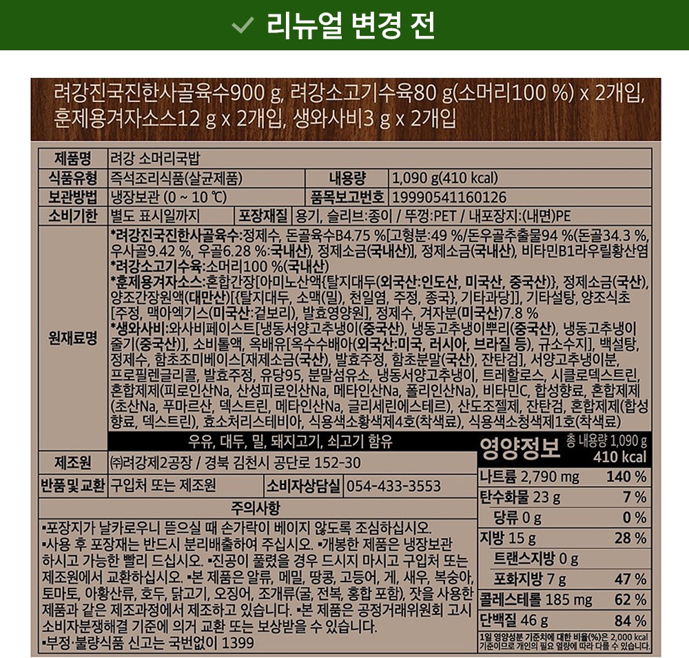 | 포장단위별 내용물의 용량(중량), 수량 | 1090g x 4개 | 원재료명 및 함량 | 컨텐츠 참조 |