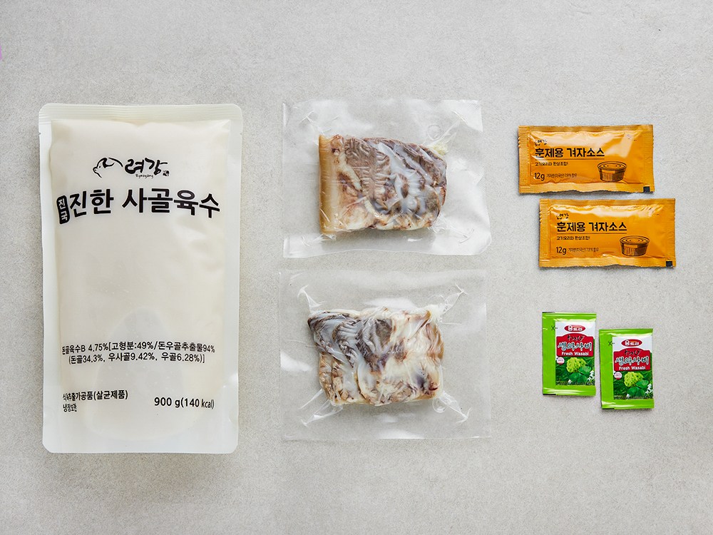 진국 진한 사골육수, 소고기수육, 훈제용 겨자소스, 생와사비로 구성되어 있습니다.