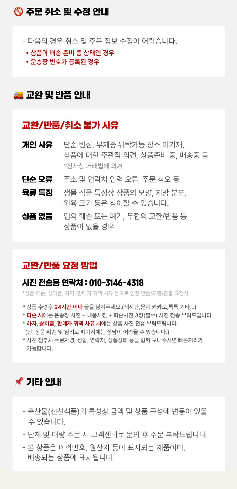 - ㆍ교환/반품에 관한 일반적인 사항은 판매자가 제시사항보다 관계법령이 우선합니다.