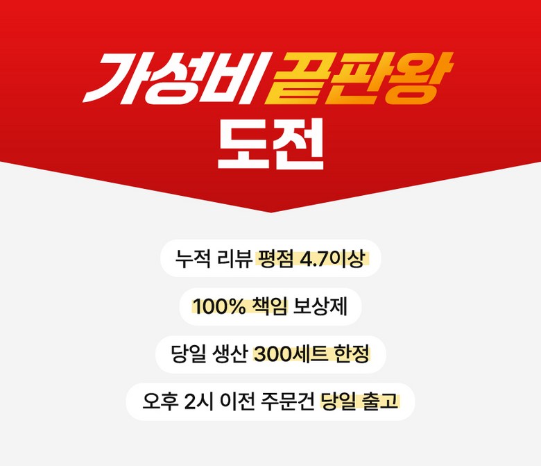 | 교환/반품 신청 기준일 | ㆍ단순변심에 의한 교환/반품은 제품 수령 후 7일 이내까지, 교환/반품 제한사항에 해당하지 않는 경우에만 가능 (배송비용과 교환/반품 비용 왕복배송비 고객부담) ㆍ상품의 내용이 표시·광고의 내용과 다른 경우에는 상품을 수령한 날부터 3개월 이내, 그 사실을 안 날 또는 알 수 있었던 날부터 |