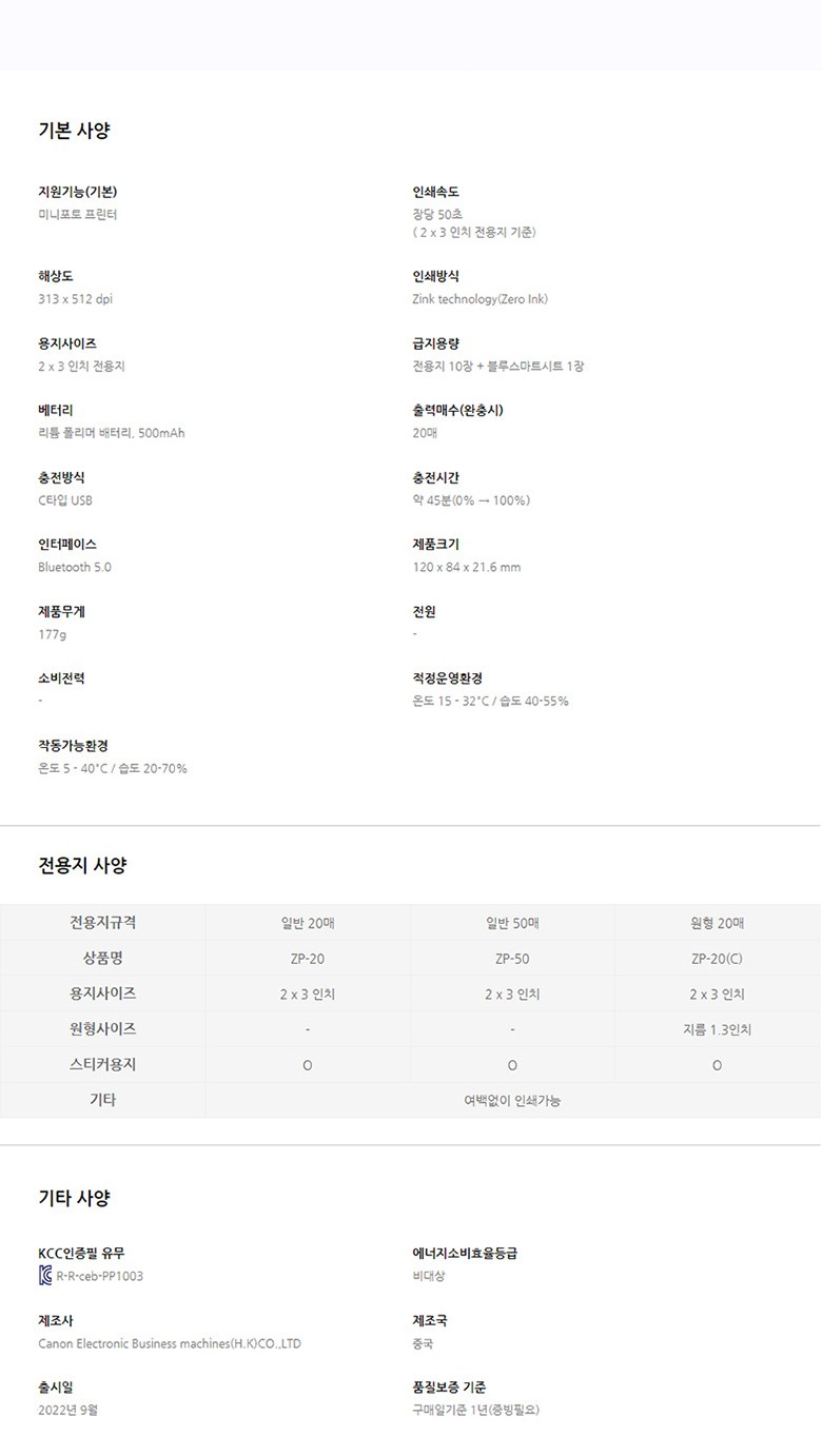| 출시년월 | 2022년 9월 | 제조자(수입자) | Canon Electronic Business Machines (H.K.) Co., Ltd. / CANON KOREA INC. |