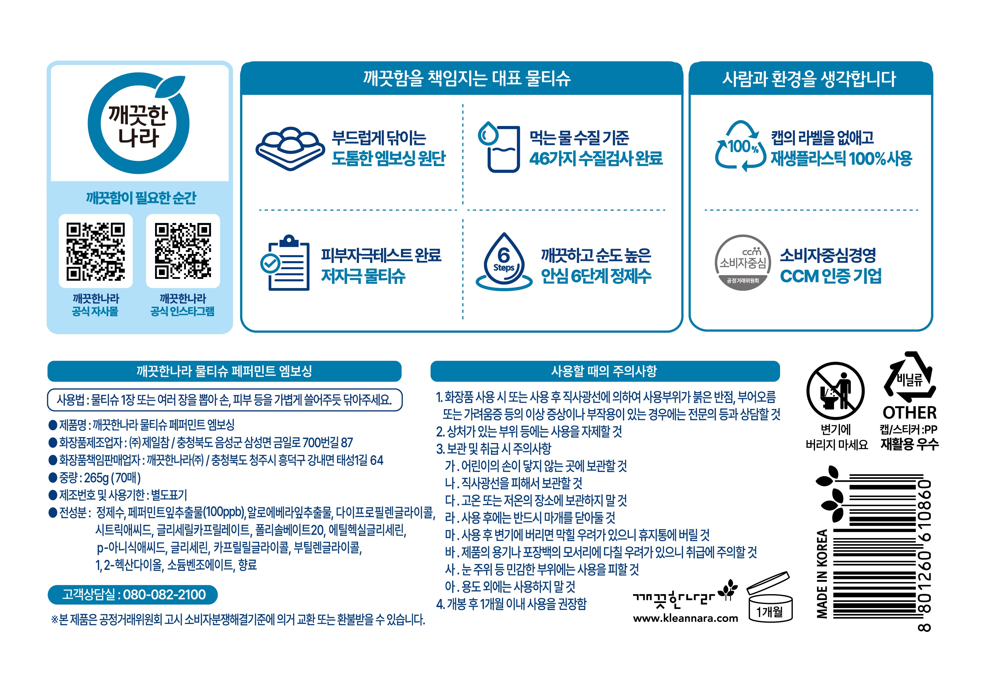 | 화장품제조업자, 화장품책임판매업자 및 맞춤형화장품판매업자 | (주)제일참 / 깨끗한나라(주) | 제조국 | 대한민국 |