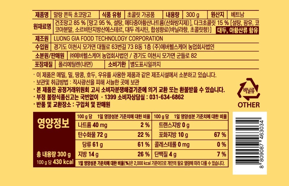 | 제품명 | 말랑 쫀득 초코 망고 | 식품의 유형 | 컨텐츠 참조 |