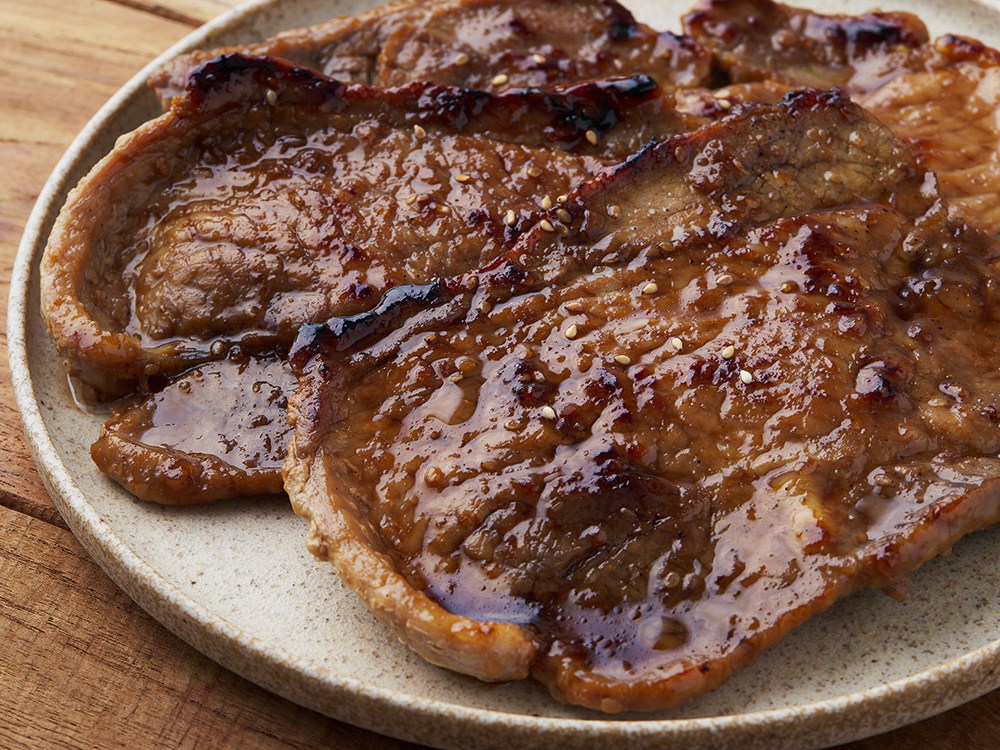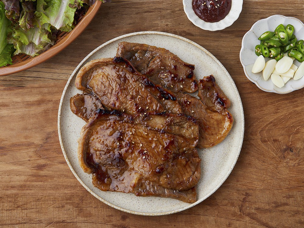 달짝지근한 갈비맛 양념구이를 소개할게요. 촘촘한 칼집 사이로 촉촉한 소스가 쏙쏙 스며들었습니다. 노릇하게 구워 먹으면, 돼지고기 뒷다리살 특유의 쫄깃쫄깃한 식감을 즐길 수 있어요. 싱그러운 쌈 채소와 같이 먹어도 좋고, 고추를 송송 썰어 곁들여도 맛있습니다.