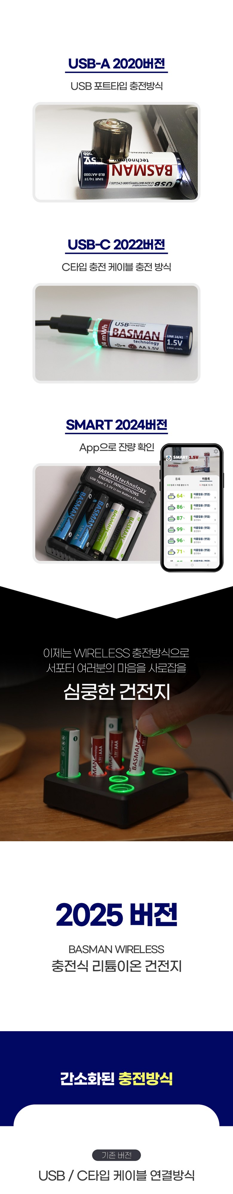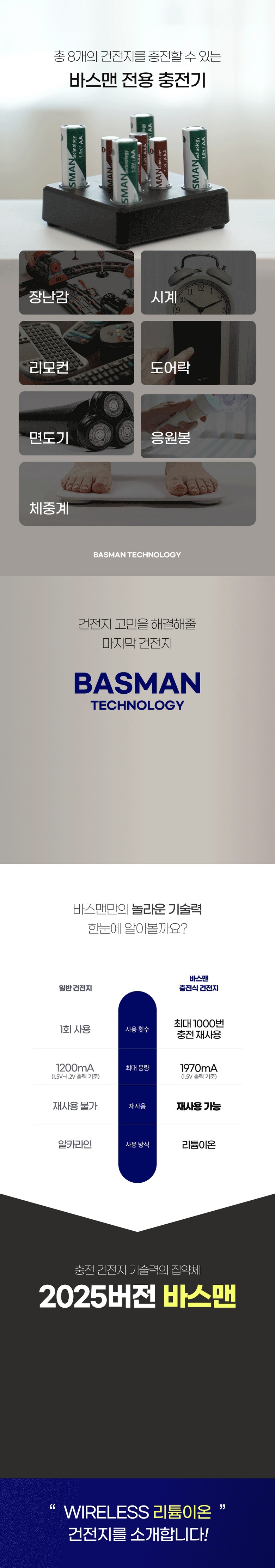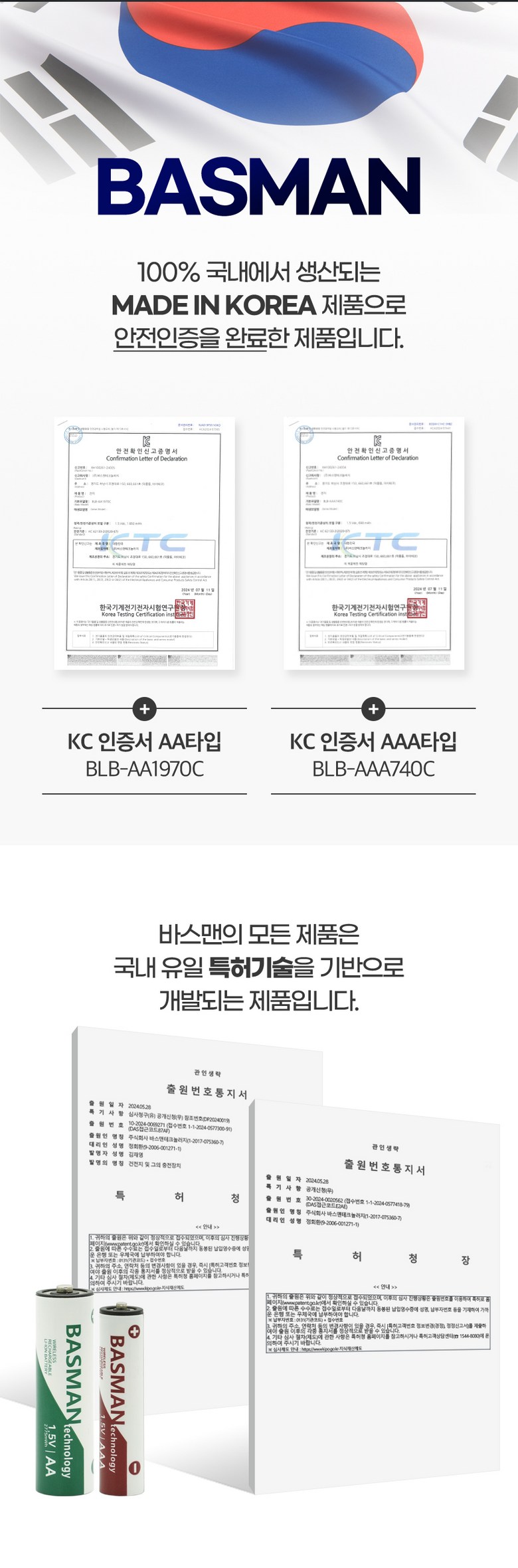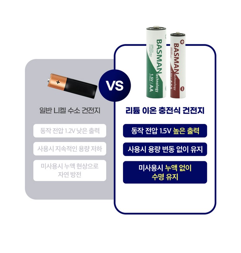 | 품명 및 모델명 | 바스맨 2.5세대 무선 충전식 건전지 리튬이온 배터리 AA + 전용 충전기 번들 | 인증/허가 사항 | KC인증 전기용품 안전확인 XH100261-24005방송통신기자재 적합성 평가 대상 R-R-ZBM-BLC-8CH |