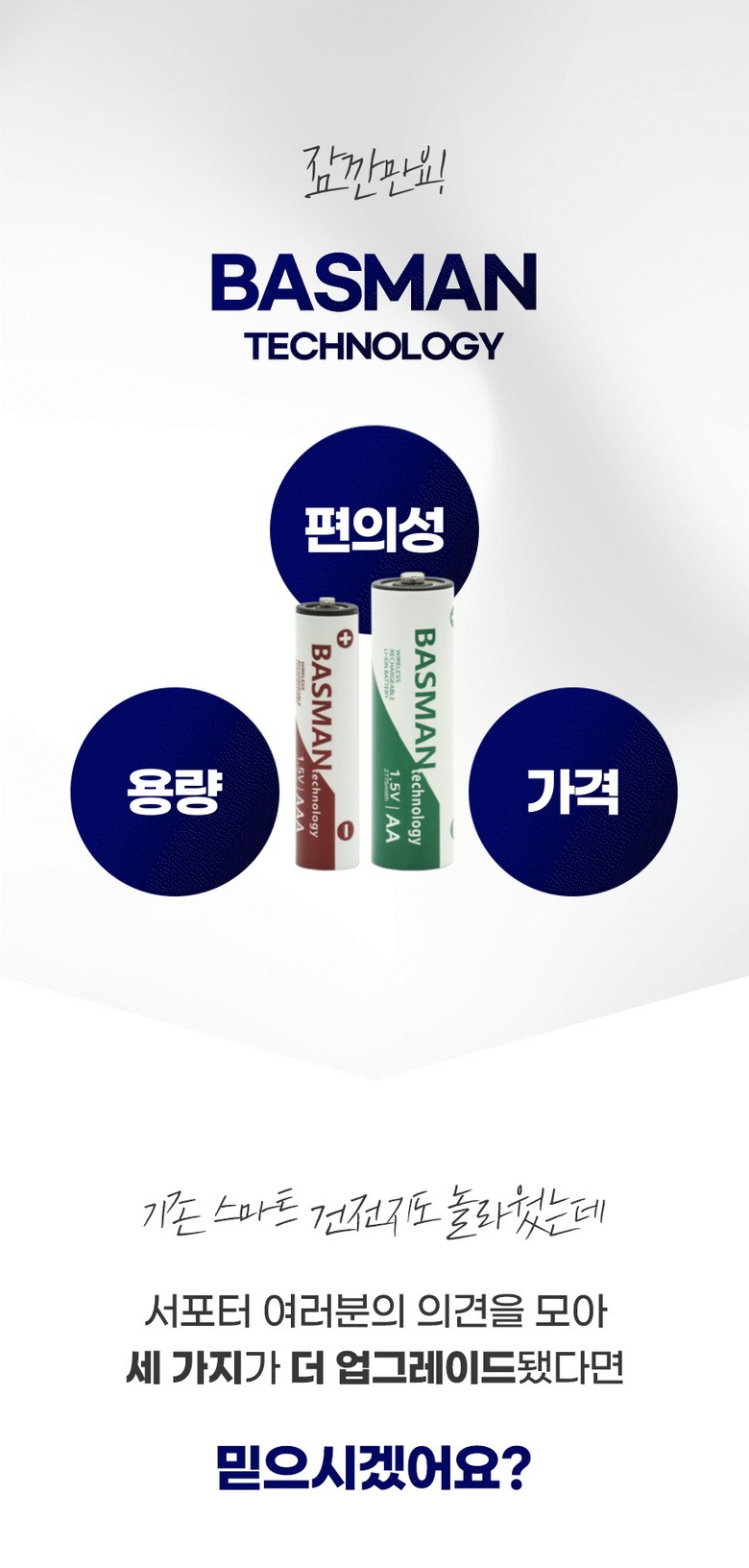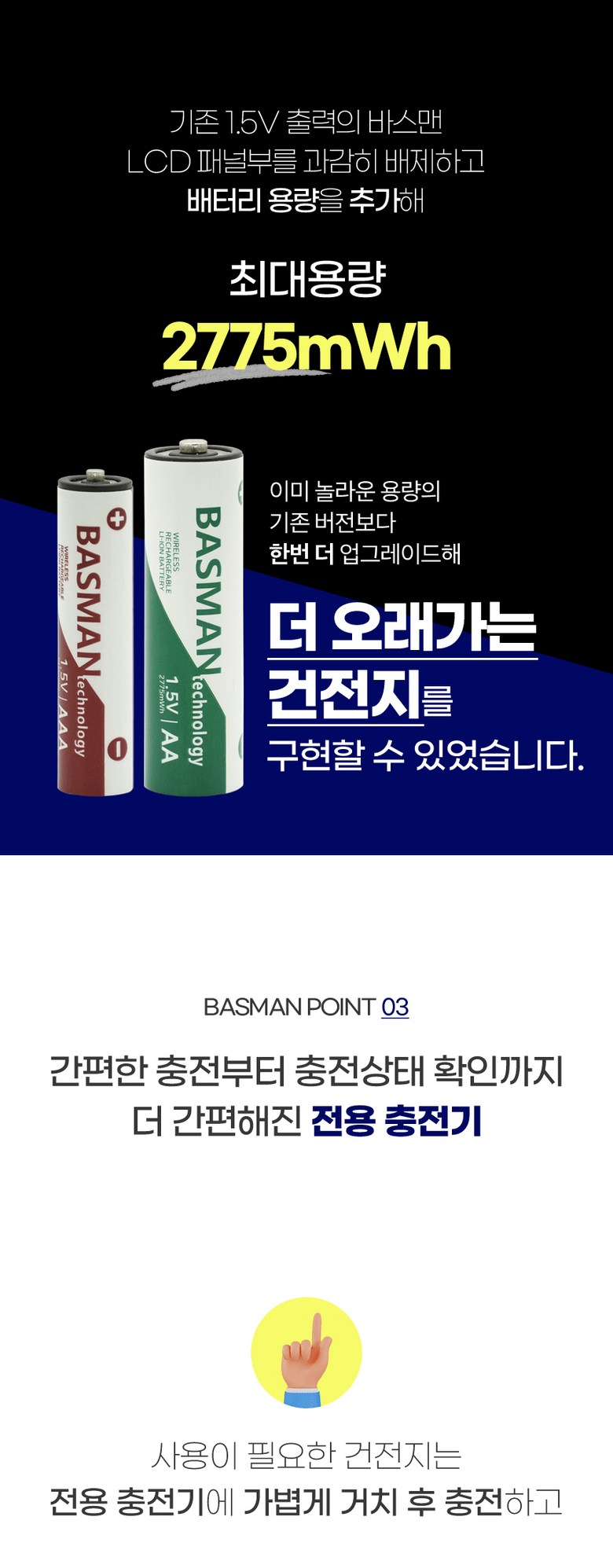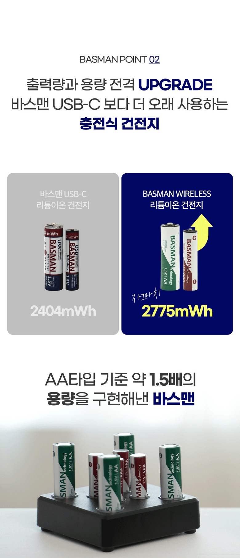 | 품명 및 모델명 | 바스맨 2.5세대 무선 충전식 건전지 리튬이온 배터리 AA + 전용 충전기 번들 | 인증/허가 사항 | KC인증 전기용품 안전확인 XH100261-24005방송통신기자재 적합성 평가 대상 R-R-ZBM-BLC-8CH |