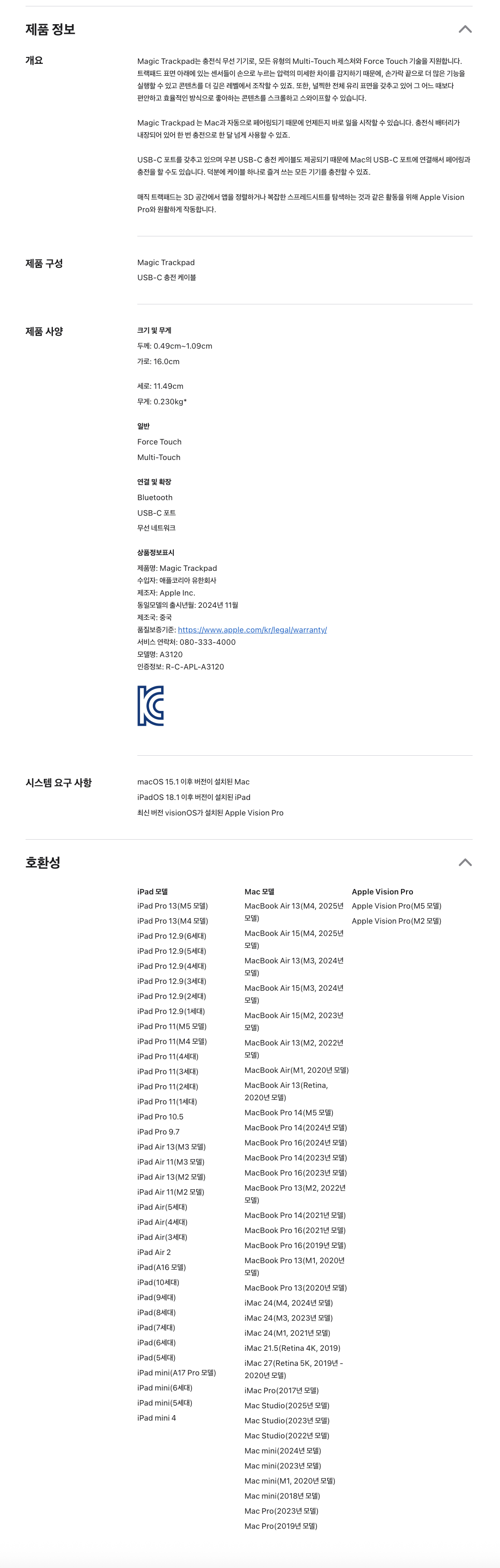 | 품명 및 모델명 | Magic Trackpad / A3120 | KC 인증정보 | R-C-APL-A3120 |