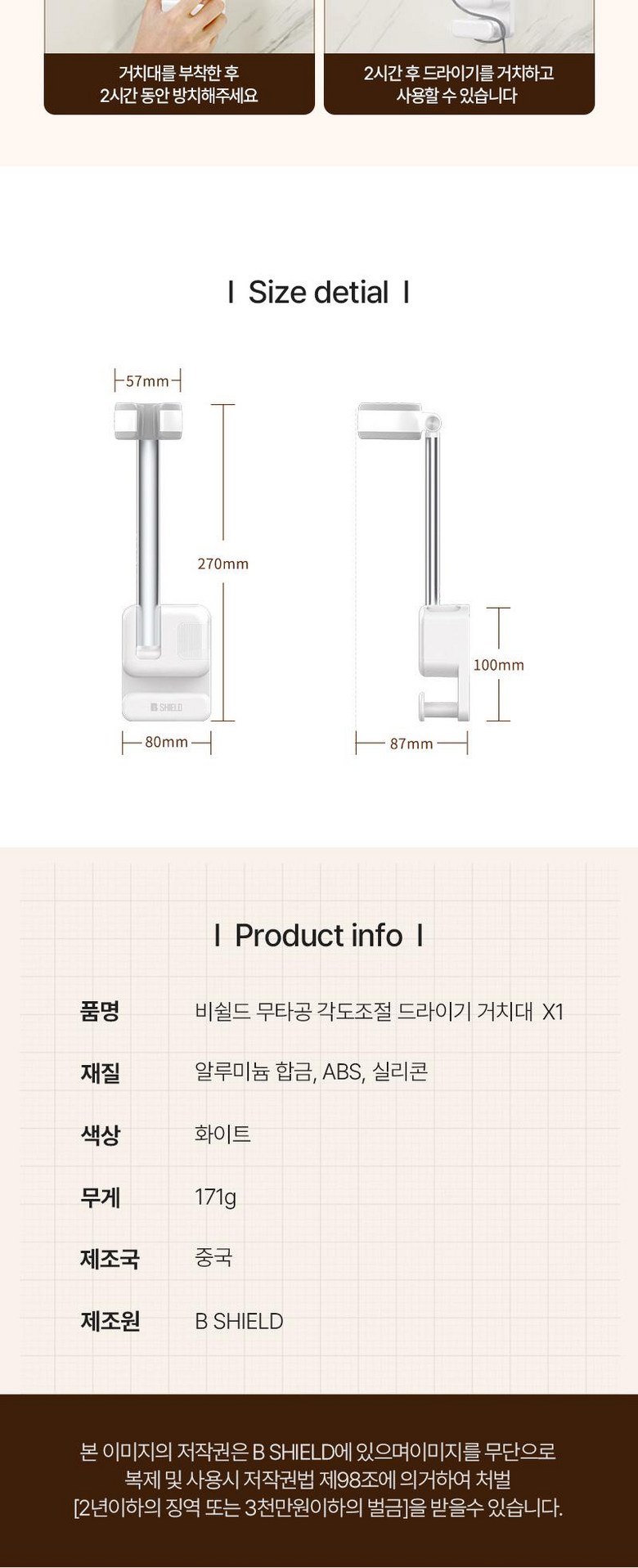 | 품명 및 모델명 | 비쉴드 각도조절 드라이기 거치대 X1 | 인증/허가 사항 | 상품 상세페이지 참조 |