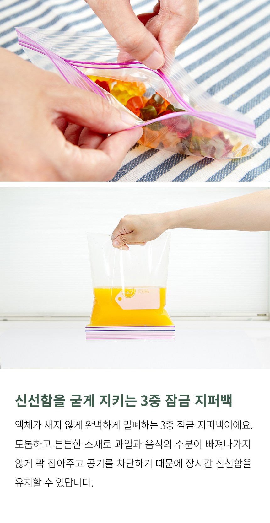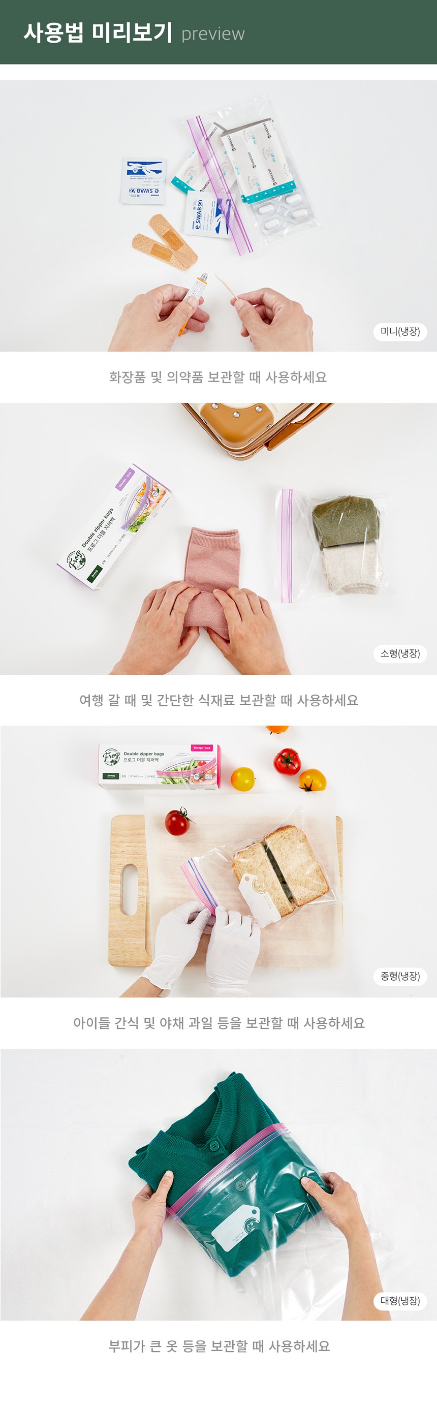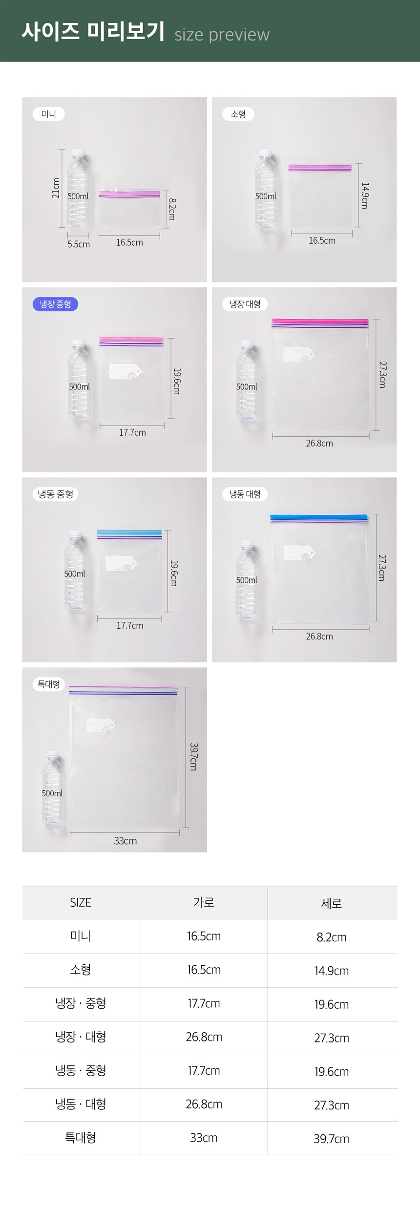 | 구성품 | 지퍼백 270매 (냉장 미니100p+소100p+중40p+대30p), 4세트 | 크기 | 컨텐츠 참조 |
