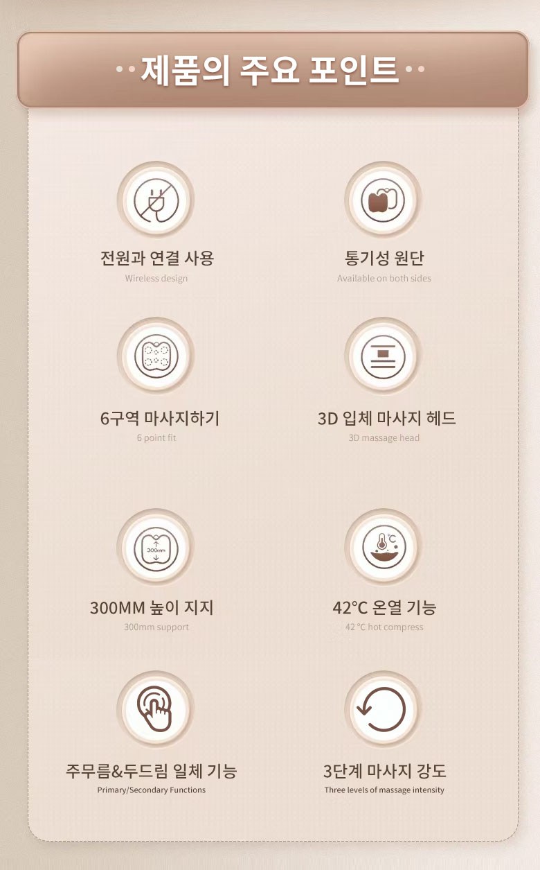 - 매번 같은 부위를 마사지할 때 15분을 초과하지 말것을 건의하며 만약 마사지중에 불편함이 있으시면 즉시 제품 사용을 중지하여야 합니다.