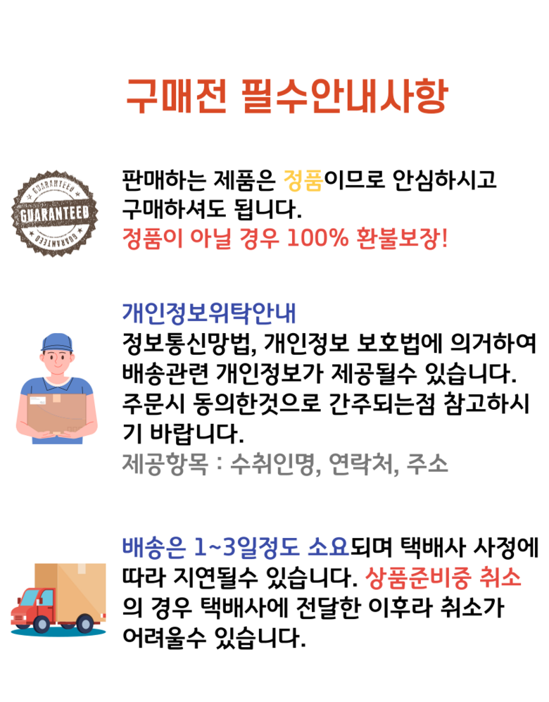 - ㆍ교환/반품에 관한 일반적인 사항은 판매자가 제시사항보다 관계법령이 우선합니다.