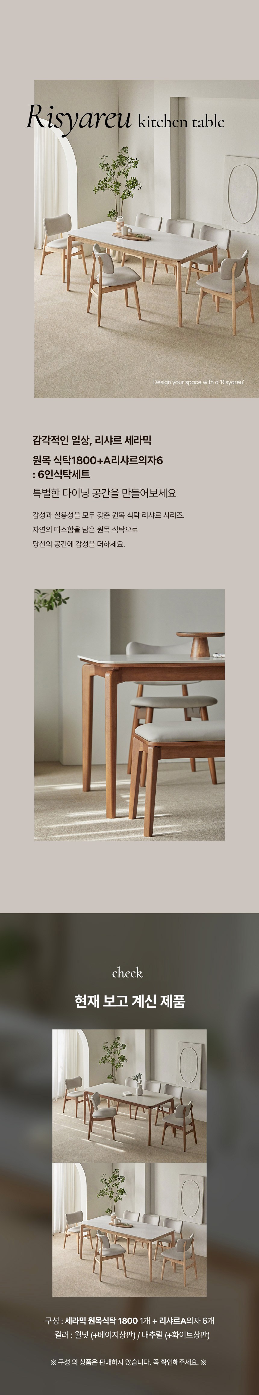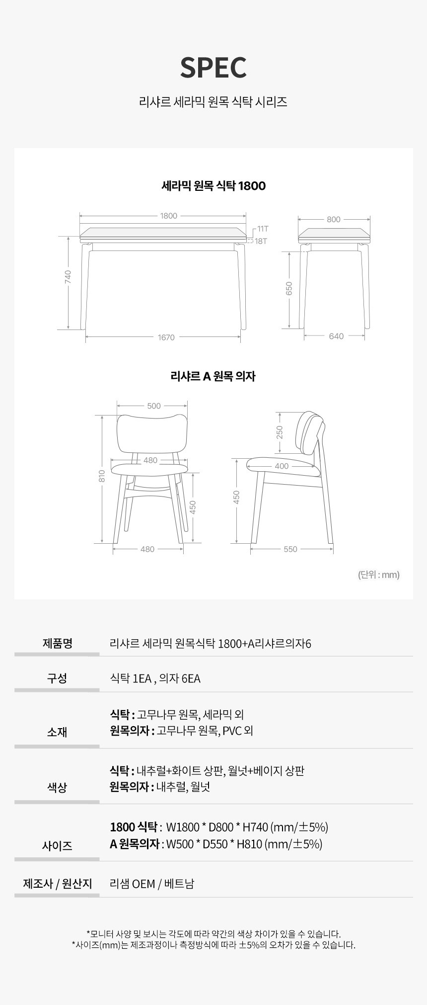 - 사이즈: 식탁(1800 x 800 x 740 mm), 의자(500 x 550 x 810 mm)