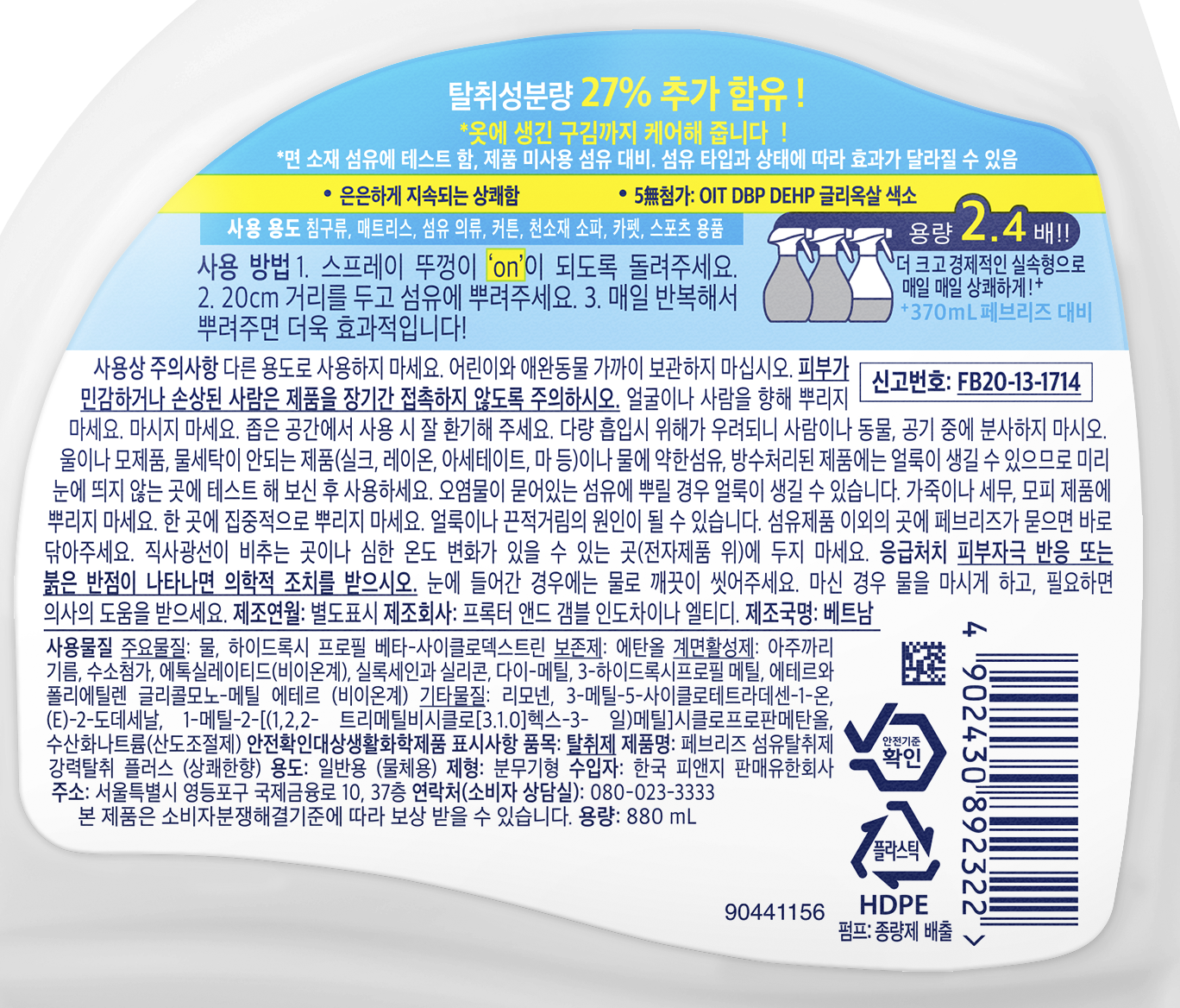 | 품목 및 제품명 | 탈취제/페브리즈 섬유탈취제 강력탈취 플러스 (상쾌한향) | 용도(표백제의 경우 계열을 함께표시) 및 제형 | 일반용(물체용)/분무기형 |