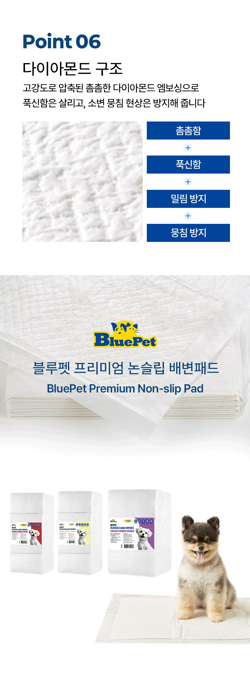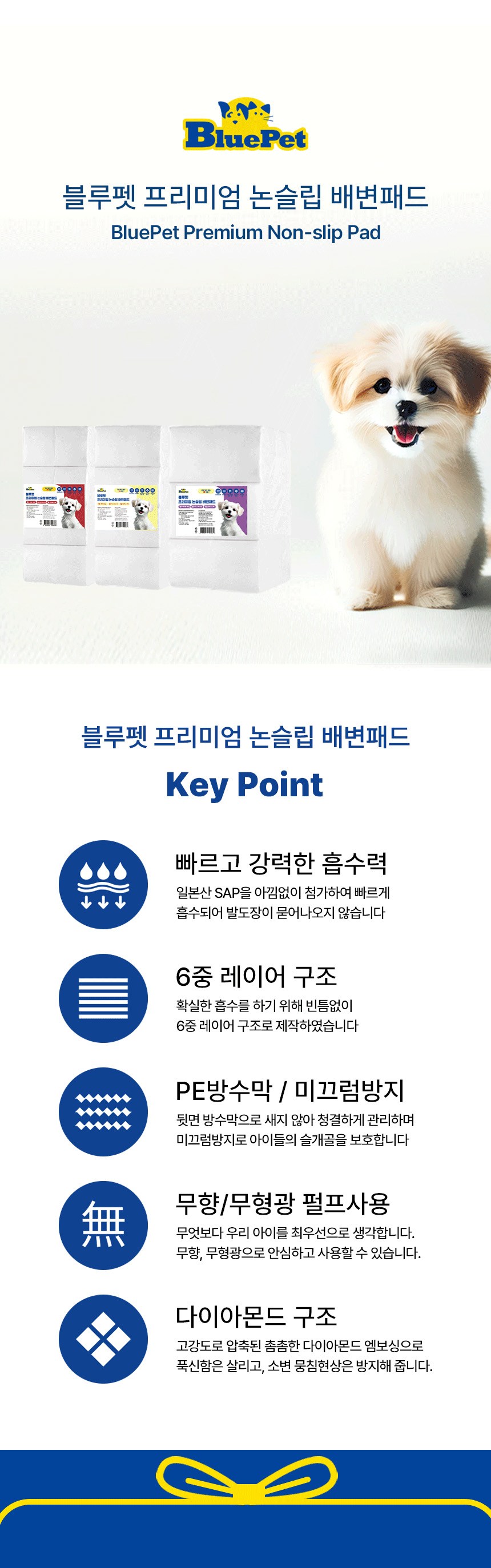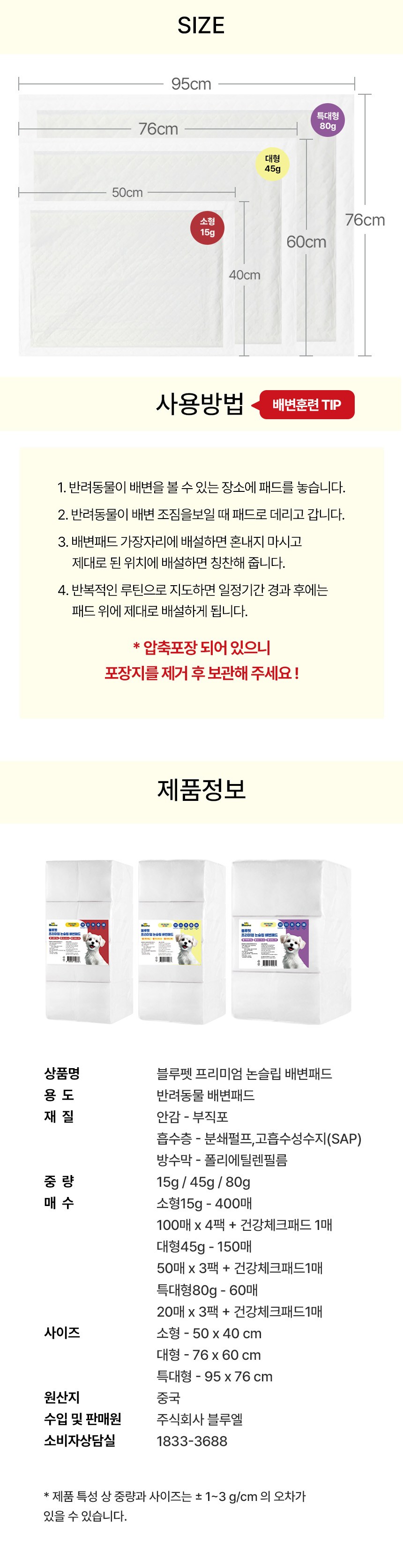 | 품명 및 모델명 | 블루펫 프리미엄 논슬립 배변패드 | 인증/허가 사항 | 해당없음 |