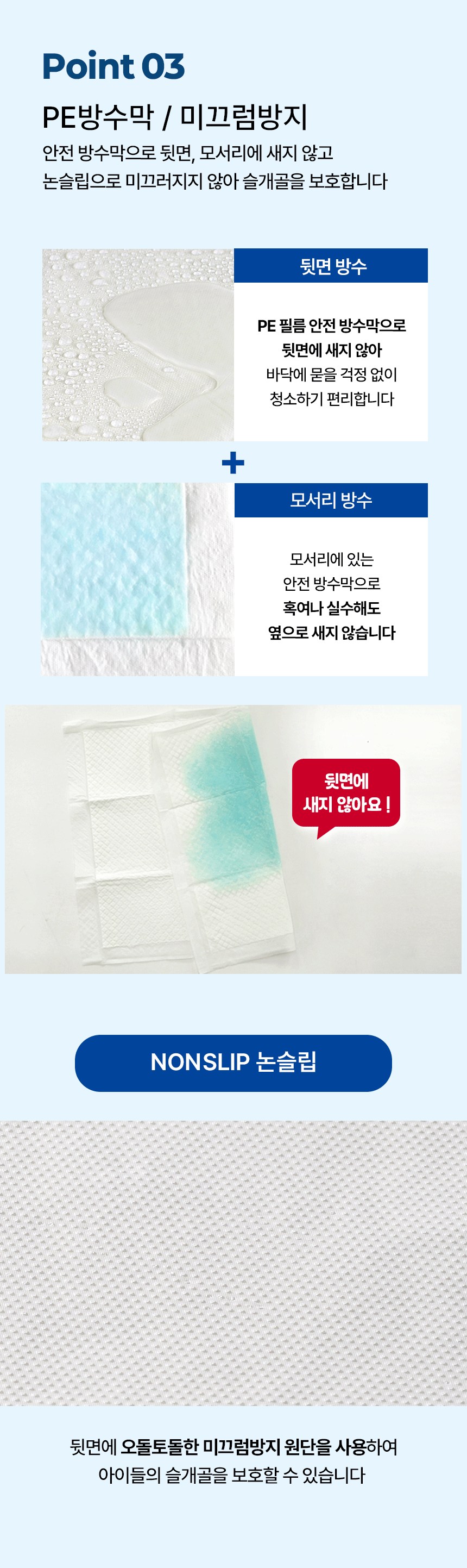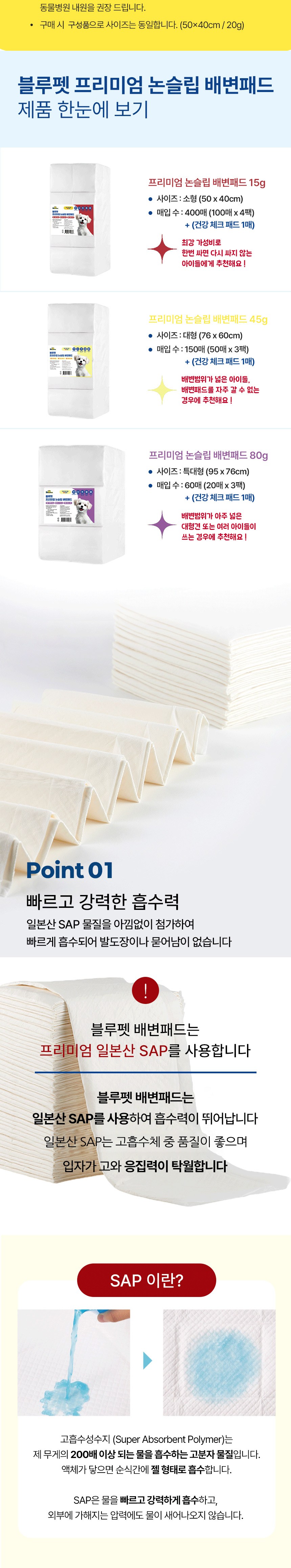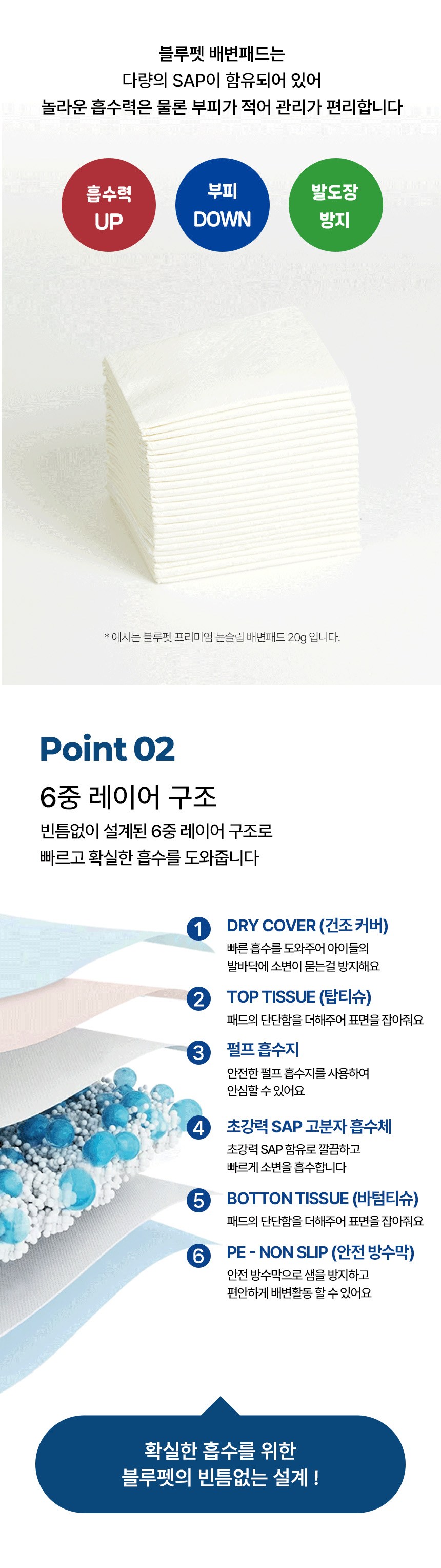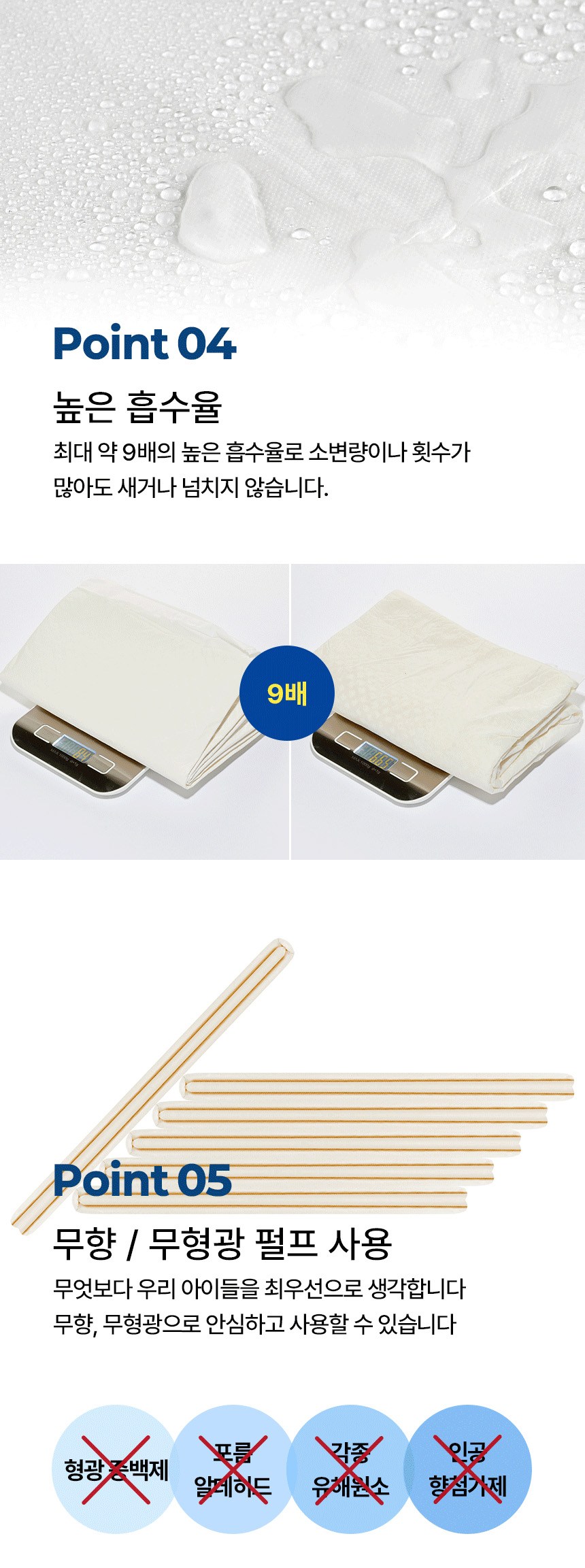 - 흡수력: 고흡수성수지 (SAP) 포함